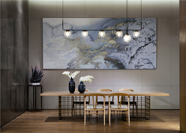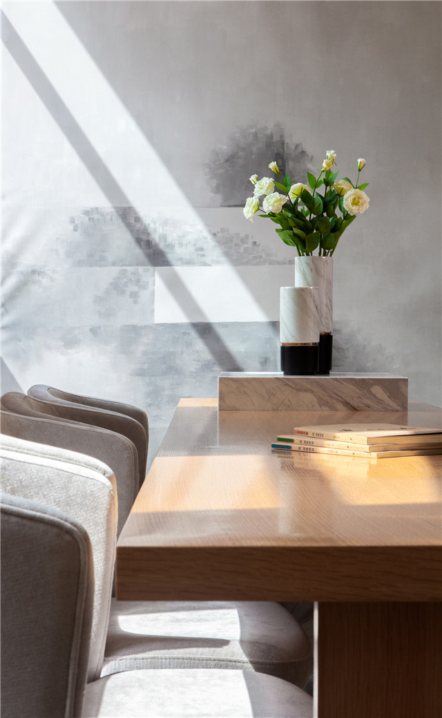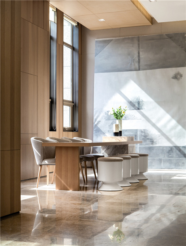 在這個空間中,以交流分享為主要功能,灰色大理石墻面將空間分設(shè)為階梯式交流區(qū)及會議區(qū),呈現(xiàn)空間的獨立性與交流的便捷性。會議區(qū)設(shè)計用微弱柔雅的光影效果、空靈的吊燈與花藝、抽象的工藝品與藝術(shù)掛畫,營造安靜私密的氛圍。
