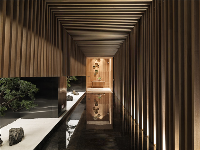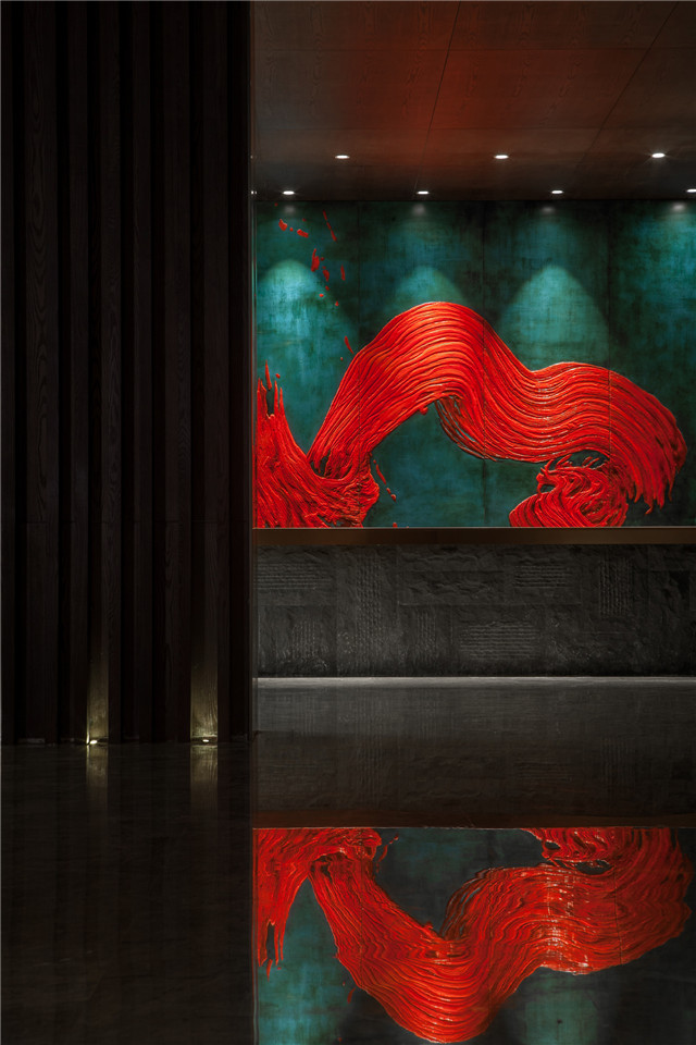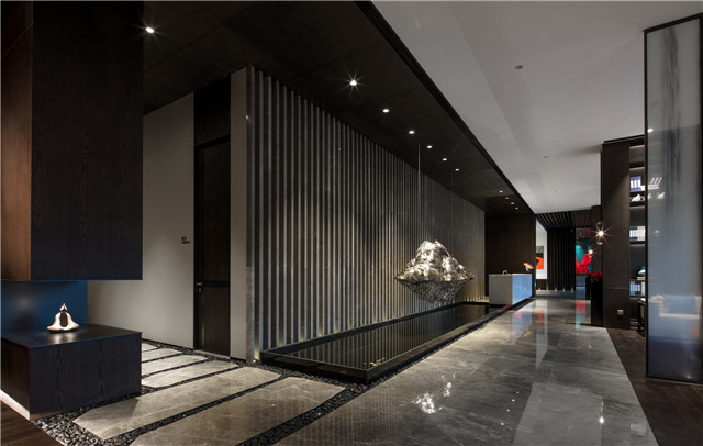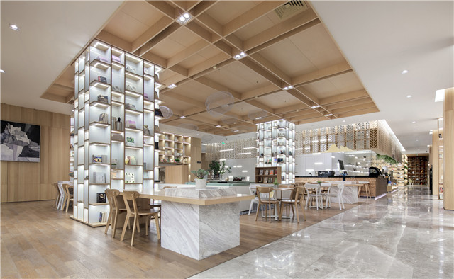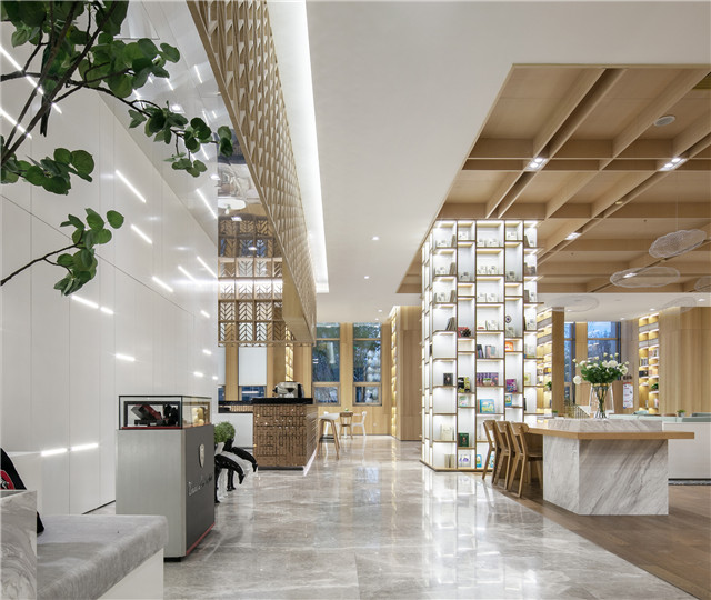 書院的接待臺以輕盈簡潔的燈飾、嵌合木柵的水紋狀大理石臺面,奠定空間的簡潔不繁麗的設(shè)計基調(diào)。接待臺以外的空間,通過與主題格調(diào)統(tǒng)一的材料、色調(diào),圍建起相生相通的幾個功能空間——藝術(shù)回廊、閱讀區(qū)、互動活動區(qū)、多功能區(qū)、簽約區(qū)。