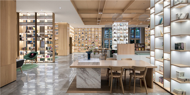 閱讀區(qū)墻面以木飾面處理,木制地板與地毯的鋪設(shè),形成功能空間的區(qū)隔效果。實木家具與暖綠色軟包、清香的花藝與趣致的云狀吊飾,呈現(xiàn)柔軟舒適的空間細節(jié)感受,令身處其中的人們有絕佳的閱讀體驗。貫穿空間的5米高的木制書架用LED燈帶營造的視覺效果,在突出隔斷與流線設(shè)計的同時,成為整個空間及場地精神的有力支撐。