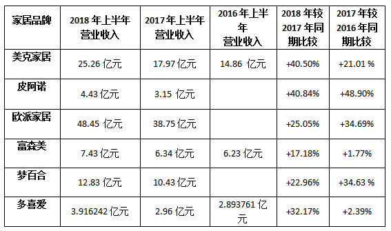 從半年報的數(shù)據(jù)來看,家居上市公司整體呈同比上升趨勢,其中3家營業(yè)收入同比增長幅度超過30%;家居賣場的收入穩(wěn)定增長,定制家居企業(yè)持續(xù)發(fā)力,業(yè)績增長明顯??梢哉f獲得資本加持后,家居上市公司增速大漲,競爭趨勢逐漸顯露。下面就跟隨新浪家居一起看下2018年1-6月的半年報盤點(diǎn)吧。