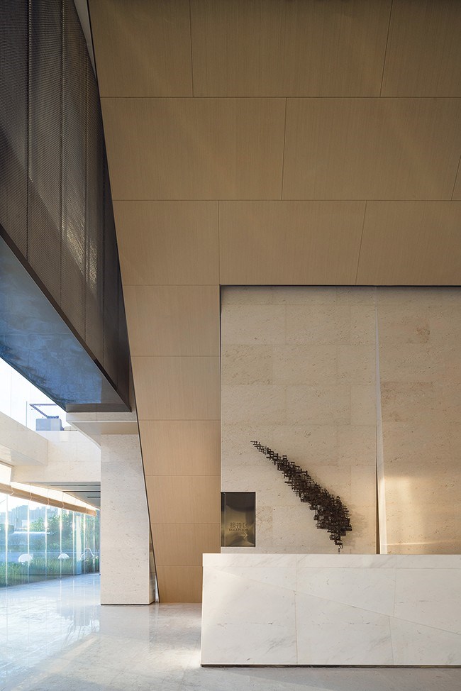 細(xì)膩的米色大理石結(jié)構(gòu)空間,相近的木色與之互相映襯,保證了整體色彩的統(tǒng)一性,協(xié)調(diào)建筑體塊塑造的莊嚴(yán)肅穆感。挑高的空間架構(gòu)中,通過天花與墻面連續(xù)一體的設(shè)計(jì),塑造出空間整體的延伸性,而墻體前后塊面的錯(cuò)落,塑造出了空間的多維層次感??臻g開闊大氣而又不至于一覽無(wú)余,簡(jiǎn)單中的微妙轉(zhuǎn)折,更新著人們的視覺感受。
