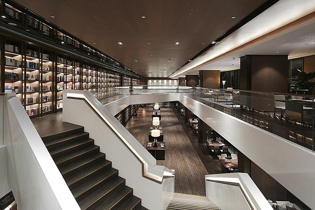 環(huán)狀的書架圍合成一個(gè)獨(dú)特的閱讀區(qū)域,同時(shí)也可作為展廊空間使用,書格之間裝配有隱藏式燈帶,形成舒適、均衡的照明效果。清新干凈的原木色,流暢優(yōu)美的圓弧線條,在書架上,憨態(tài)可掬的藝術(shù)雕像爬于高高的階梯,渲染出一份恬靜舒愜的氛圍。