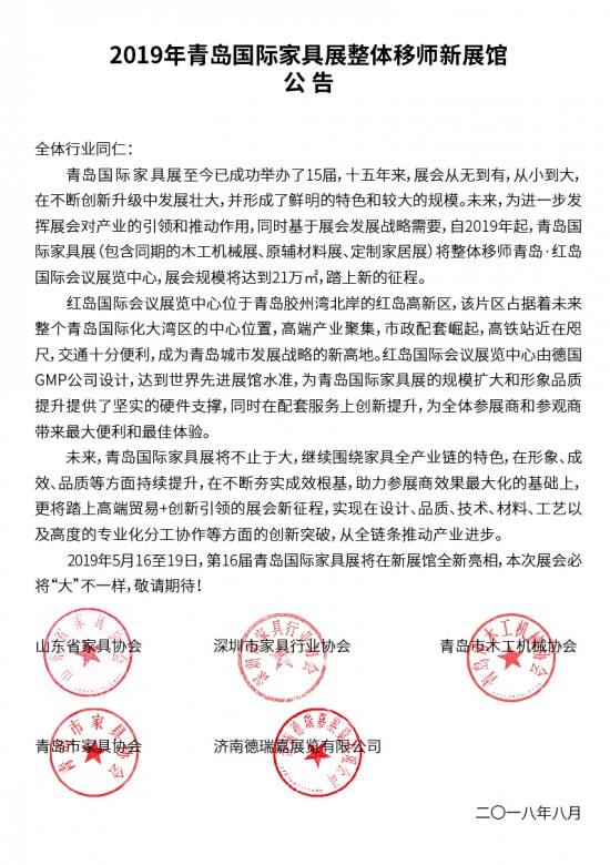 8月24日,青島國際家具展主承辦單位聯(lián)合發(fā)布公告稱,自2019年起,青島國際家具展(同期:全屋定制、木工機(jī)械及原輔材料展)將整體移師青島·紅島國際會議展覽中心舉辦,屆時展會總規(guī)模將達(dá)到210000㎡,舉辦時間為2019年5月16-19日。