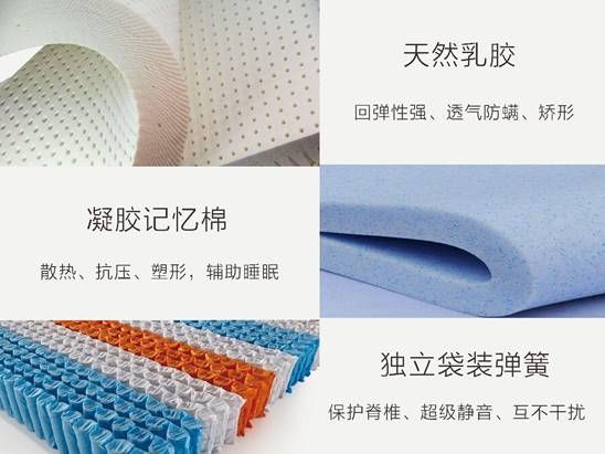 1.   采用凝膠記憶棉+乳膠作為舒適墊層,解決睡眠問題(輔助睡眠),凝膠記憶棉,把冷卻性能優(yōu)異的凝膠珠鉗入到透氣性極好的記憶棉,冷卻凝膠珠吸入人體熱量,再通過記憶棉將熱量和水氣排放到空氣中,天然乳膠,具有身體順應(yīng)性和壓力回彈性,能理想的支撐身體,兩種特性特性交相輝映,形成一種獨(dú)特的輔助睡眠系統(tǒng),既能針對(duì)不同人體進(jìn)行塑造,緩解人體的體壓,不壓迫血管,促進(jìn)血液循環(huán),縮短淺睡眠時(shí)間,促進(jìn)深度睡眠,又有天然乳膠提供的超強(qiáng)舒適性,如入云端、擁有嬰兒般的深度睡眠。