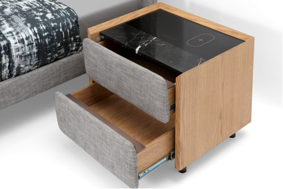 床頭柜具備無(wú)線充電和鬧鐘設(shè)置功能,很好地起到配套作用。