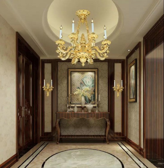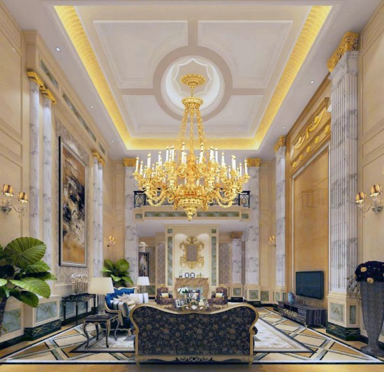 以華麗的裝飾、濃烈的色彩、精美的造型達(dá)到雍容華貴的裝飾效果。在歐式建筑照明設(shè)計(jì)中客廳頂部喜用大型燈池,并用華麗的枝形吊燈營造氣氛。