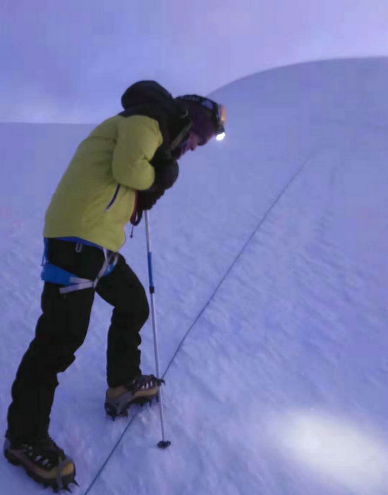 天公作美,時間到了凌晨兩點,風終于停了。在進行了一個小時的準備工作之后,黃總于凌晨三點正式從C1出發(fā)沖頂。此時,人的體能倒在其次,更為重要的是你需要通過意志來不斷喚醒你的體能,堅定你的信念,以及堅忍不拔向上走的精神。尤其是5900米以上的最后300米海拔,此時心臟高頻跳動和氣喘吁吁已是常態(tài),零下二十度的寒冷、高空的冷風以及毫無遮擋的冰雪路線,對你的身心都將是最為嚴峻的巨大挑戰(zhàn)。在這個時候,放棄的念頭會一再閃現(xiàn),唯有強大的意志才能促使你一步一步堅定的向上走,唯有強大的意志才能激發(fā)出你所有的潛能,去戰(zhàn)勝一切。
