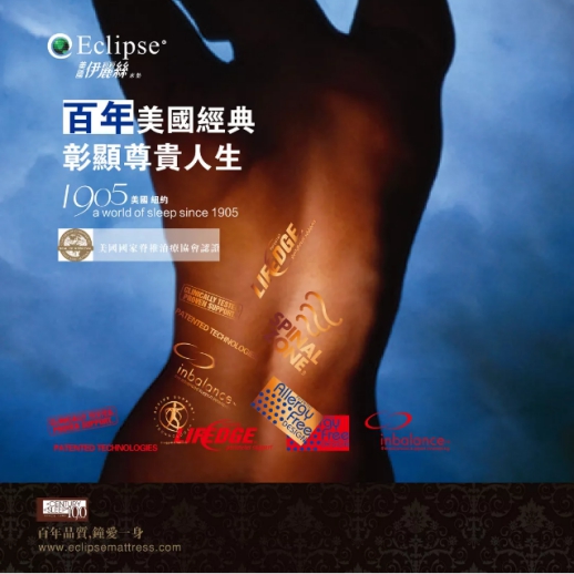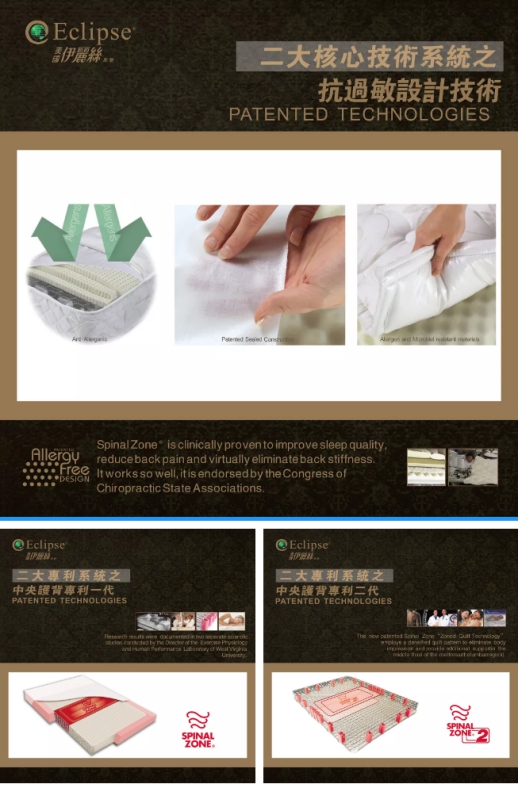 在全球市場上專門為“護(hù)脊”而設(shè)計的床墊品牌,最早的就是來自美國的Eclipse伊麗絲床墊,在1967年發(fā)明的被稱為“床中床”的“中央護(hù)背”設(shè)計,可以減輕腰部、背部及脊椎的壓力,保持人體的曲線美,能有效提高29%的睡眠質(zhì)量,提高34%減輕背部疼痛功能,提高96%背部疾病預(yù)防功能,被世界公認(rèn)為護(hù)脊床墊領(lǐng)域的專家,也是全球唯一一家獲得美國國家脊椎治療協(xié)會認(rèn)證的床墊品牌。