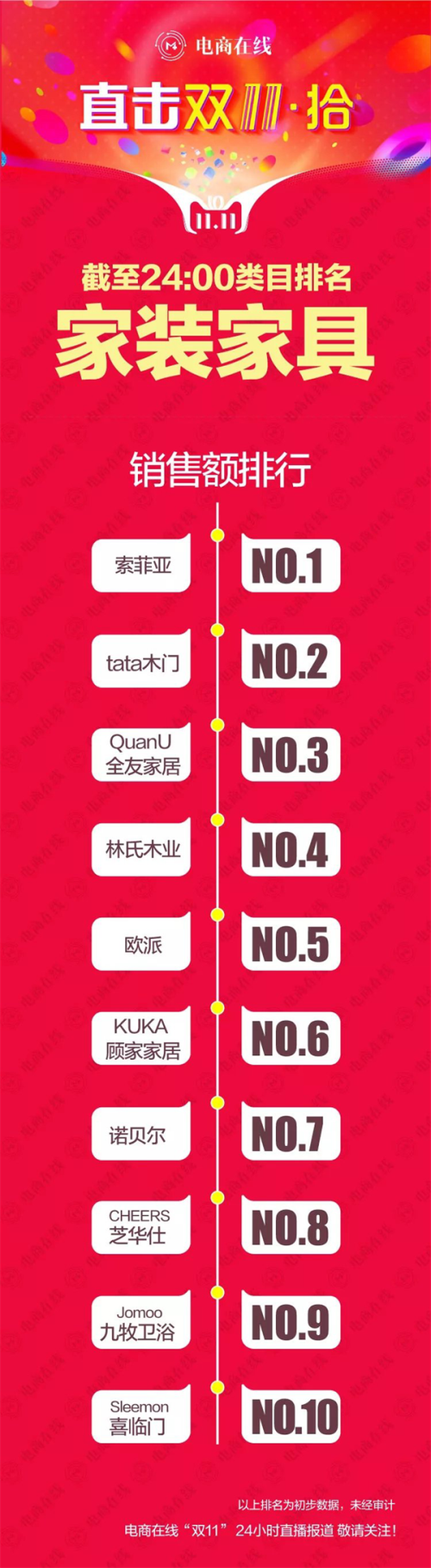 11月12日消息,天貓雙11家裝家具TOP10榜單出爐,截止11月11日24:00,排名如下:第一,索菲亞;第二,tata木門;第三,QuanU/全友家居。