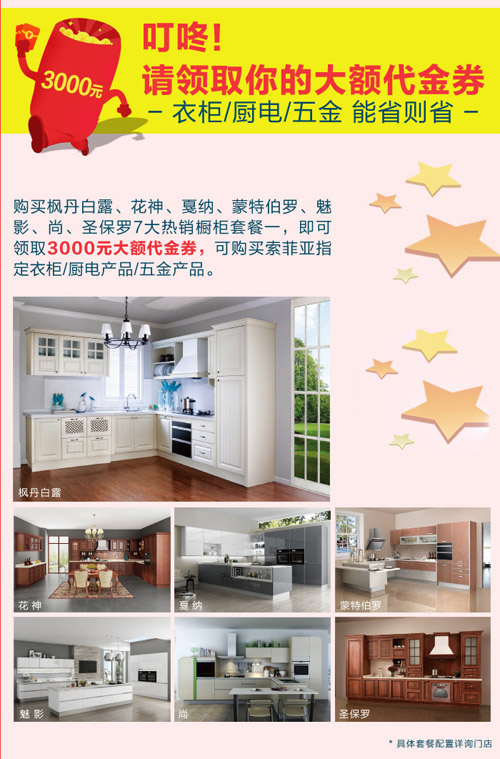 活動期間,凡購買司米櫥柜楓丹白露、花神、戛納、蒙特伯羅、魅影、尚、圣保羅這七款經(jīng)典櫥柜任一款,均可獲贈3000元代金券。代金券可用于購買4㎡索菲亞799套餐移門大衣柜或者司米廚電五金產(chǎn)品。此外,司米櫥柜與索菲亞衣柜櫥衣同購滿38000元(司米櫥柜與索菲亞衣柜各滿10000元以上),即可加1999元換購西門子價值3729元的洗衣機。