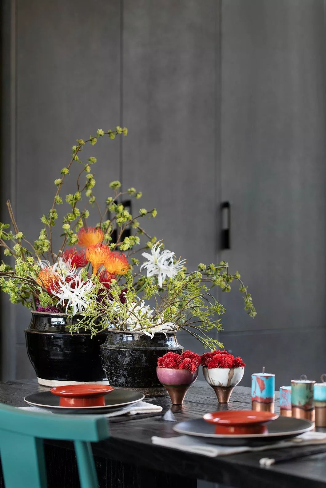 用餐區(qū)位于客廳一隅,窗外便是幾株青翠修竹,棕色原木桌上擺放著沉靜清恬的紫花,黑色的組合圓形圖案,讓空間的表現(xiàn)力更顯豐盈。