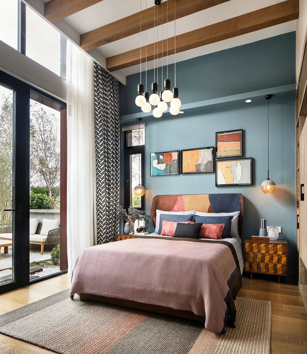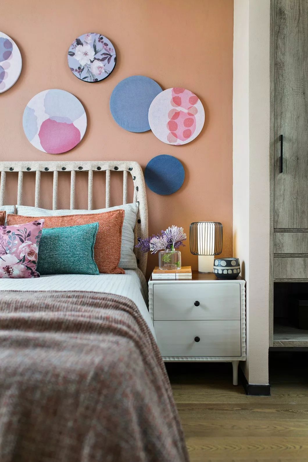 在臥室空間的處理中,布魯盟設(shè)計(jì)融入了更多的當(dāng)代筆觸。抽象水粉裝飾畫,通過色彩的調(diào)和來營(yíng)造空間的夢(mèng)幻田園氣息。