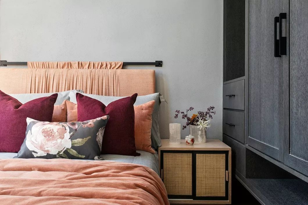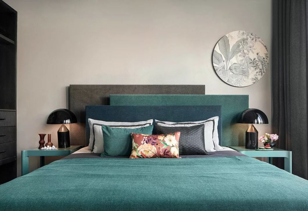 設(shè)計(jì)在清涼與溫?zé)?、沉著與明艷之間尋覓到微妙的平衡,汲取于自然的色彩,亦有著恰到好處的人文溫度。臥室空間設(shè)計(jì)融入了簡(jiǎn)約的幾何色塊,結(jié)合自然靈韻和極具傳統(tǒng)氣質(zhì)的飾物,使空間氛圍顯得悠然而生動(dòng)。