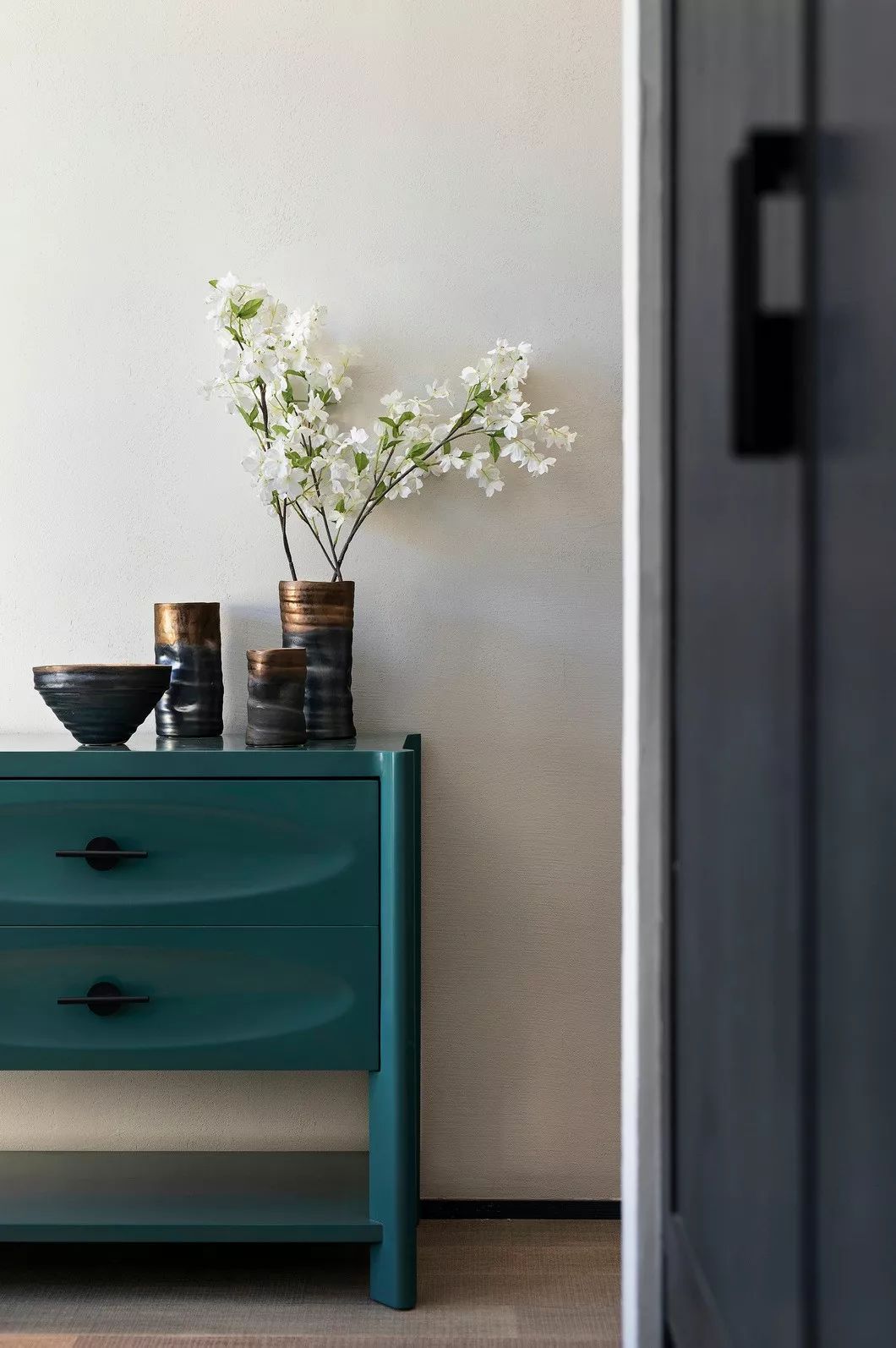 家具配設(shè)以干凈的麻布白色、清雅的銅銹綠色與沉凝的深黑形成色彩組合,絕妙的搭配似有某種無法言說的默契感。