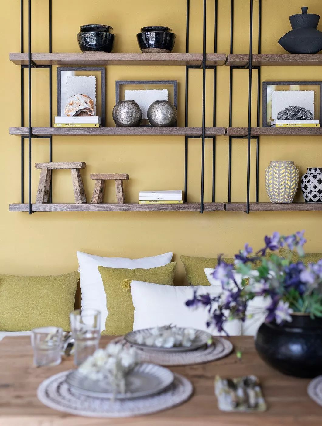 客廳空間為長(zhǎng)方形格局,軟裝陳設(shè)亦順延空間的形態(tài)構(gòu)設(shè),獨(dú)特的長(zhǎng)形沙發(fā)幾乎貫通靠墻一側(cè),背景墻為生動(dòng)的暖黃色,一改常規(guī)家庭客廳的樣貌,獨(dú)具韻味與格調(diào)。
