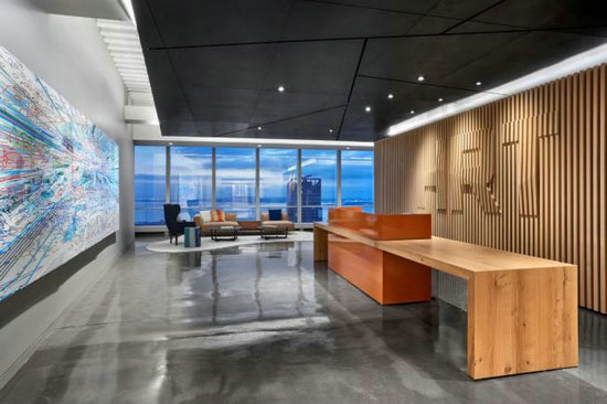 位于美國(guó)紐約的Hudson River Trading辦公室設(shè)計(jì)項(xiàng)目,其前臺(tái)“HRT”背景墻是由美國(guó)橡木制成