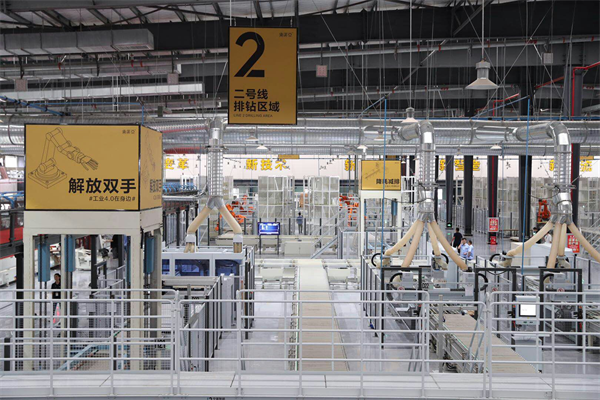 “用科技重新定義生產(chǎn)”,是索菲亞對黃岡工業(yè)4.0 車間的定義。4.0 車間實現(xiàn)原料板件從智能立體原料倉出發(fā),經(jīng)過開料、封邊、打孔、分揀、打包等工序,全部由機械臂、智能物流系統(tǒng)等自動完成,全程不落地、不經(jīng)人手。