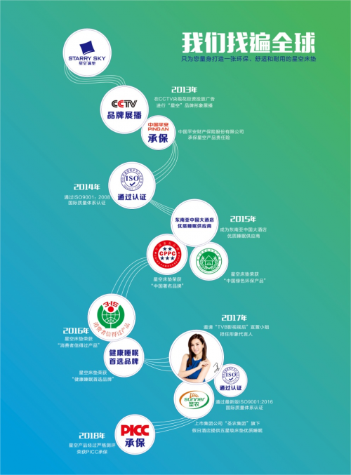 星空床墊創(chuàng)立以來堅(jiān)持走環(huán)保創(chuàng)新之路,全部產(chǎn)品自始至終堅(jiān)持百分比純環(huán)保的原材料進(jìn)行生產(chǎn),真正的做到“我們找遍全世界,只為您量身智造一張環(huán)保,舒適,耐用的星空床墊”自主研發(fā)設(shè)計(jì)出屬于星空的標(biāo)志性產(chǎn)品——星空竹纖維床墊,致力于打造獨(dú)一無二、健康高端的睡眠享受,經(jīng)過多年努力已經(jīng)在國內(nèi)高端床墊市場中占有強(qiáng)地位。