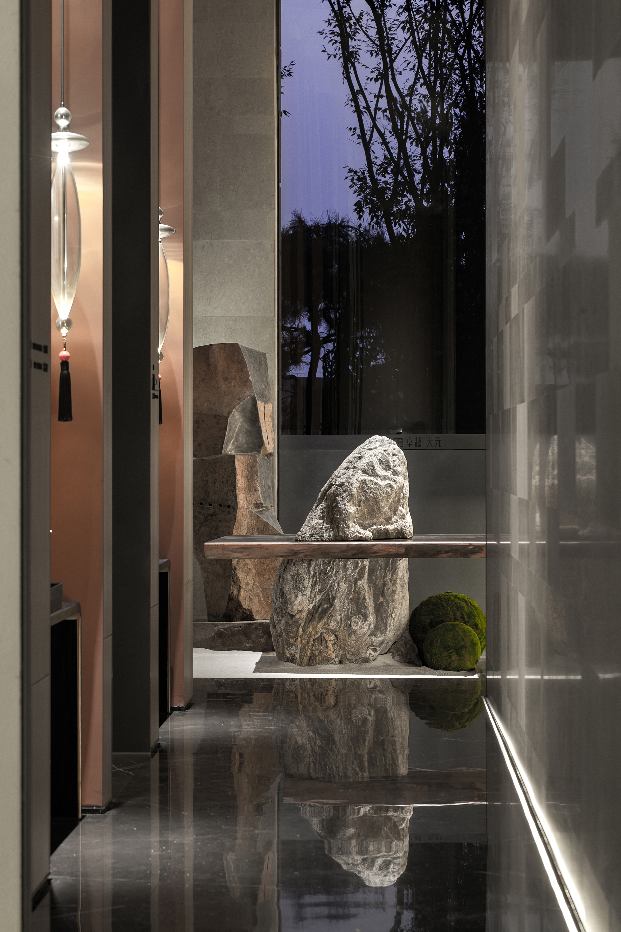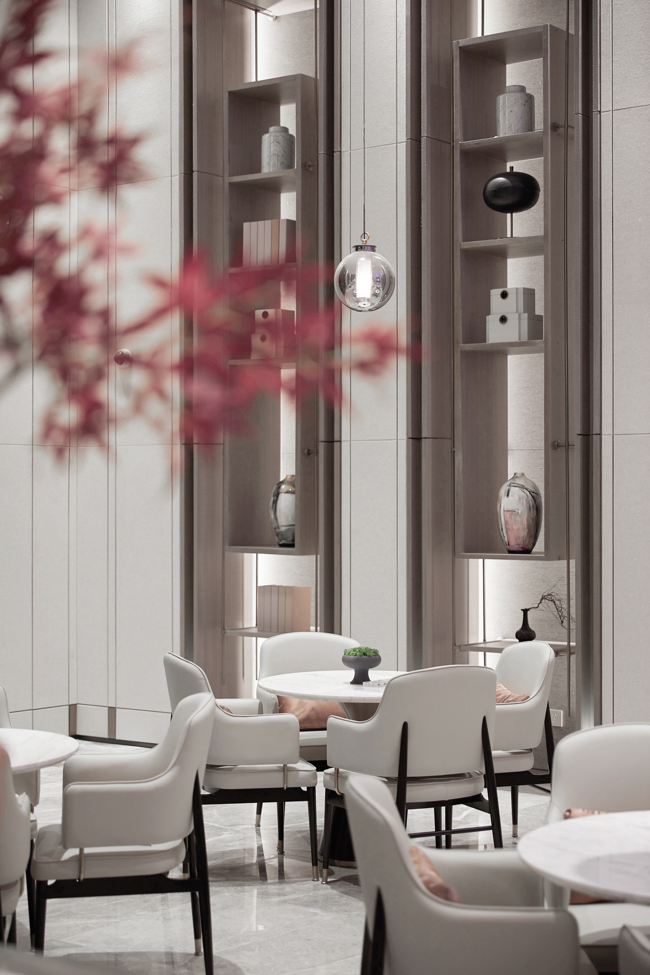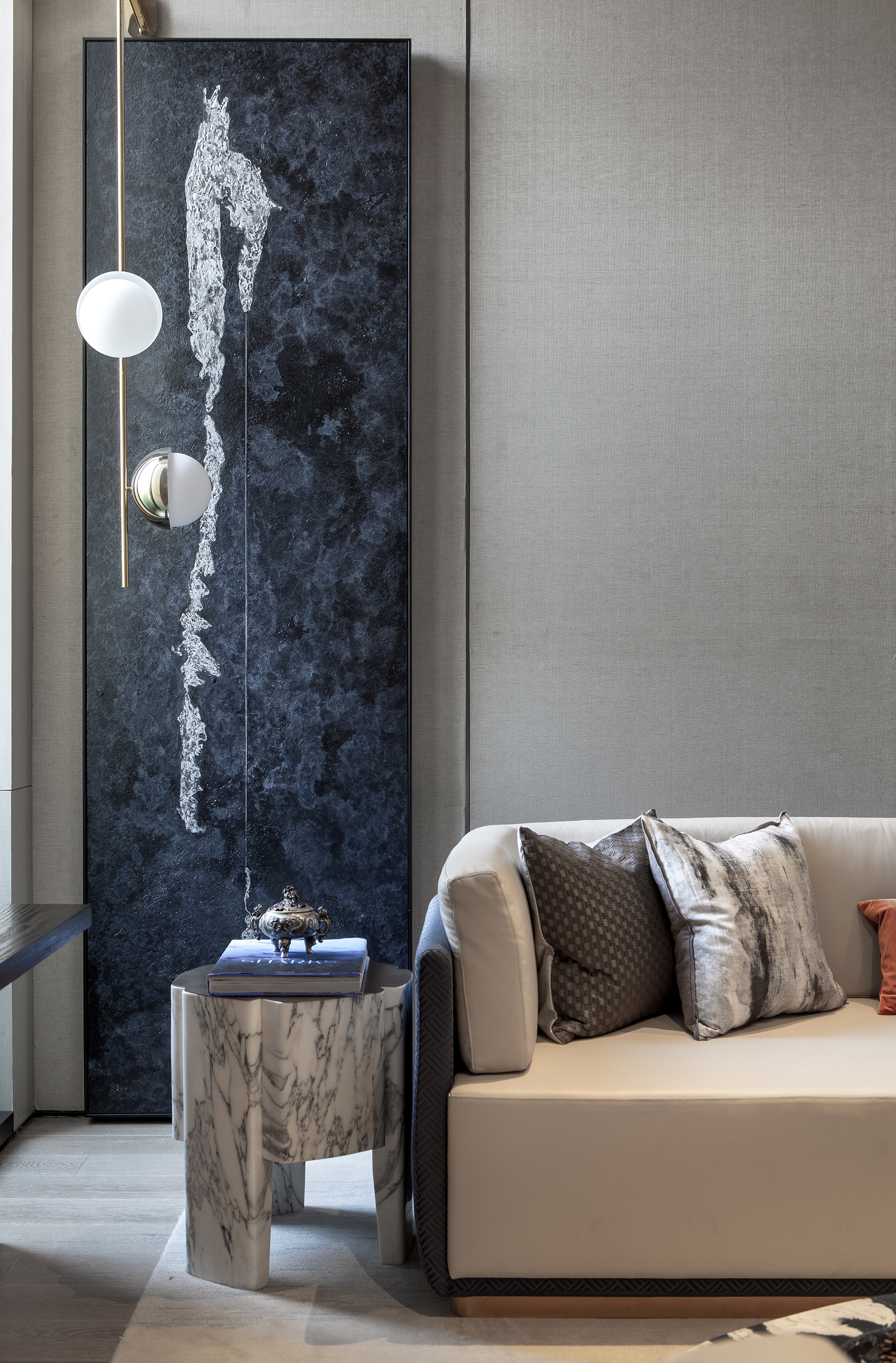 空間糅合著秩序節(jié)奏與空靈飄逸感,軟裝陳設(shè)簡約內(nèi)斂,與整體硬裝渾然一體。留有縫隙的天花吊頂設(shè)計,結(jié)合專業(yè)的燈光氛圍營造,讓整個空間呈現(xiàn)出尊貴、當代的不凡氣質(zhì)。