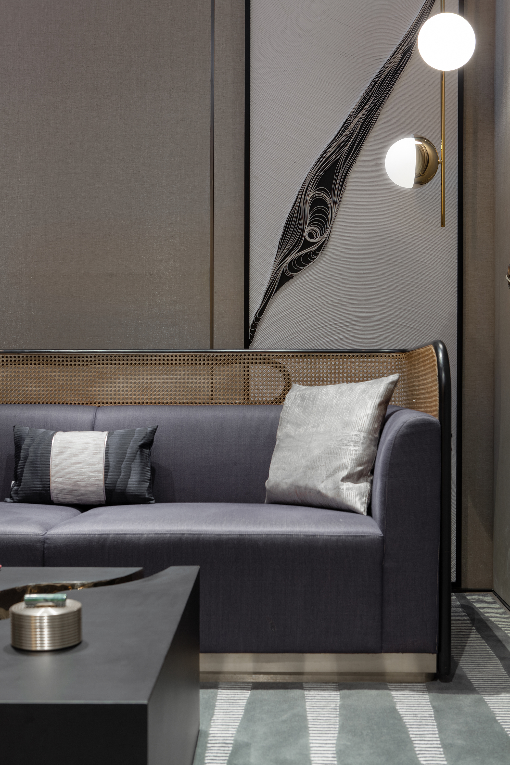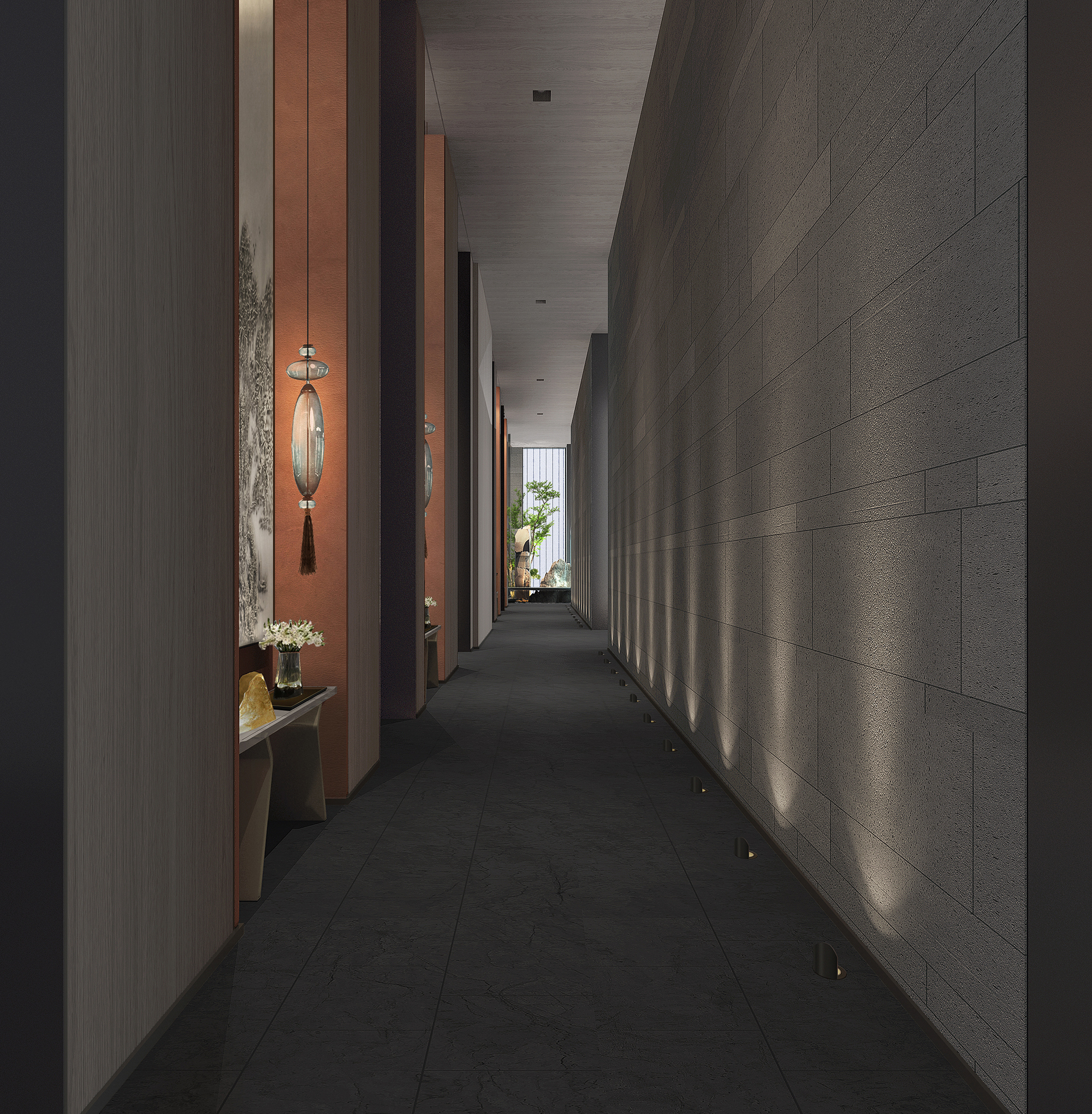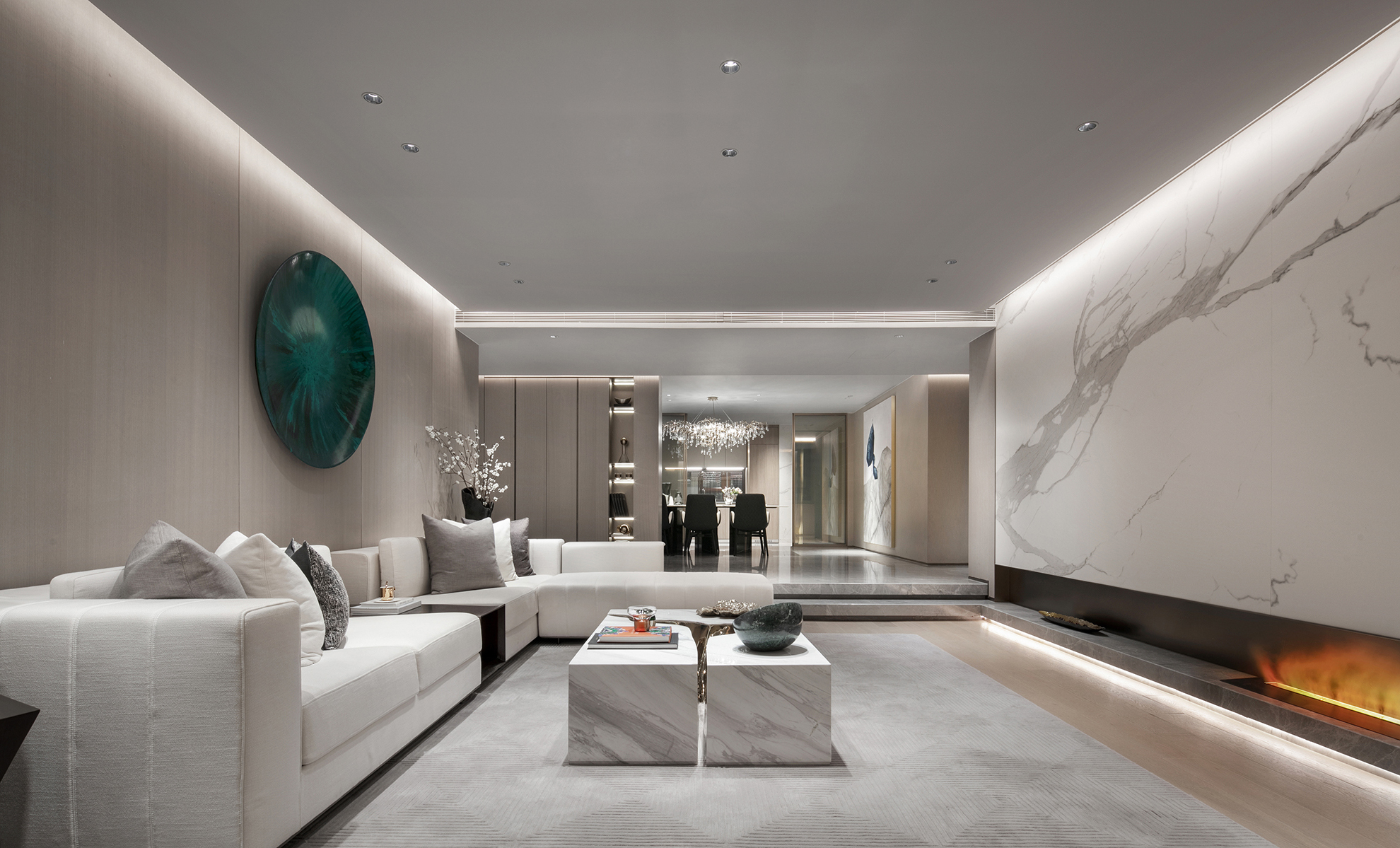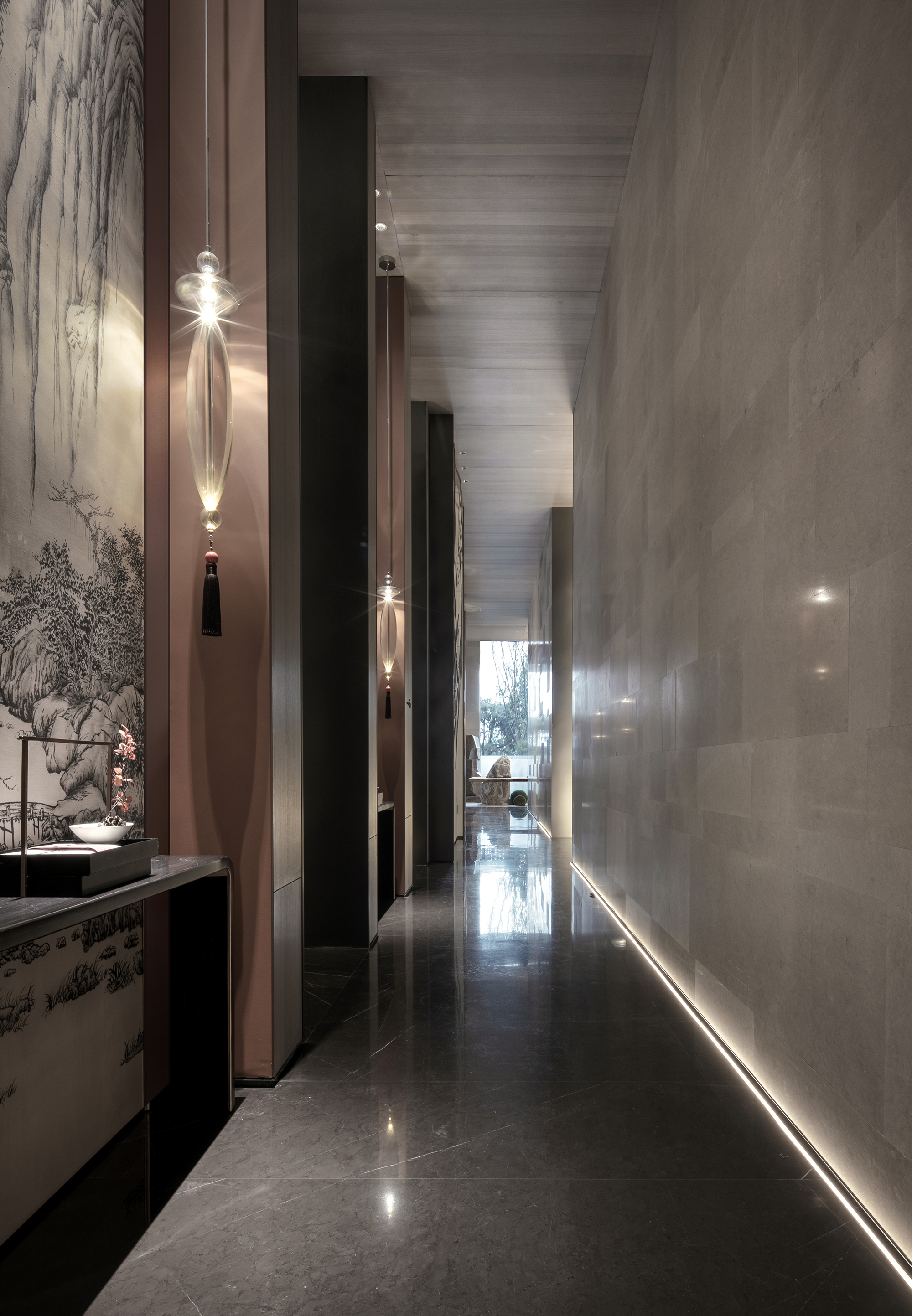 空間糅合著秩序節(jié)奏與空靈飄逸感,軟裝陳設(shè)簡約內(nèi)斂,與整體硬裝渾然一體。留有縫隙的天花吊頂設(shè)計,結(jié)合專業(yè)的燈光氛圍營造,讓整個空間呈現(xiàn)出尊貴、當代的不凡氣質(zhì)。