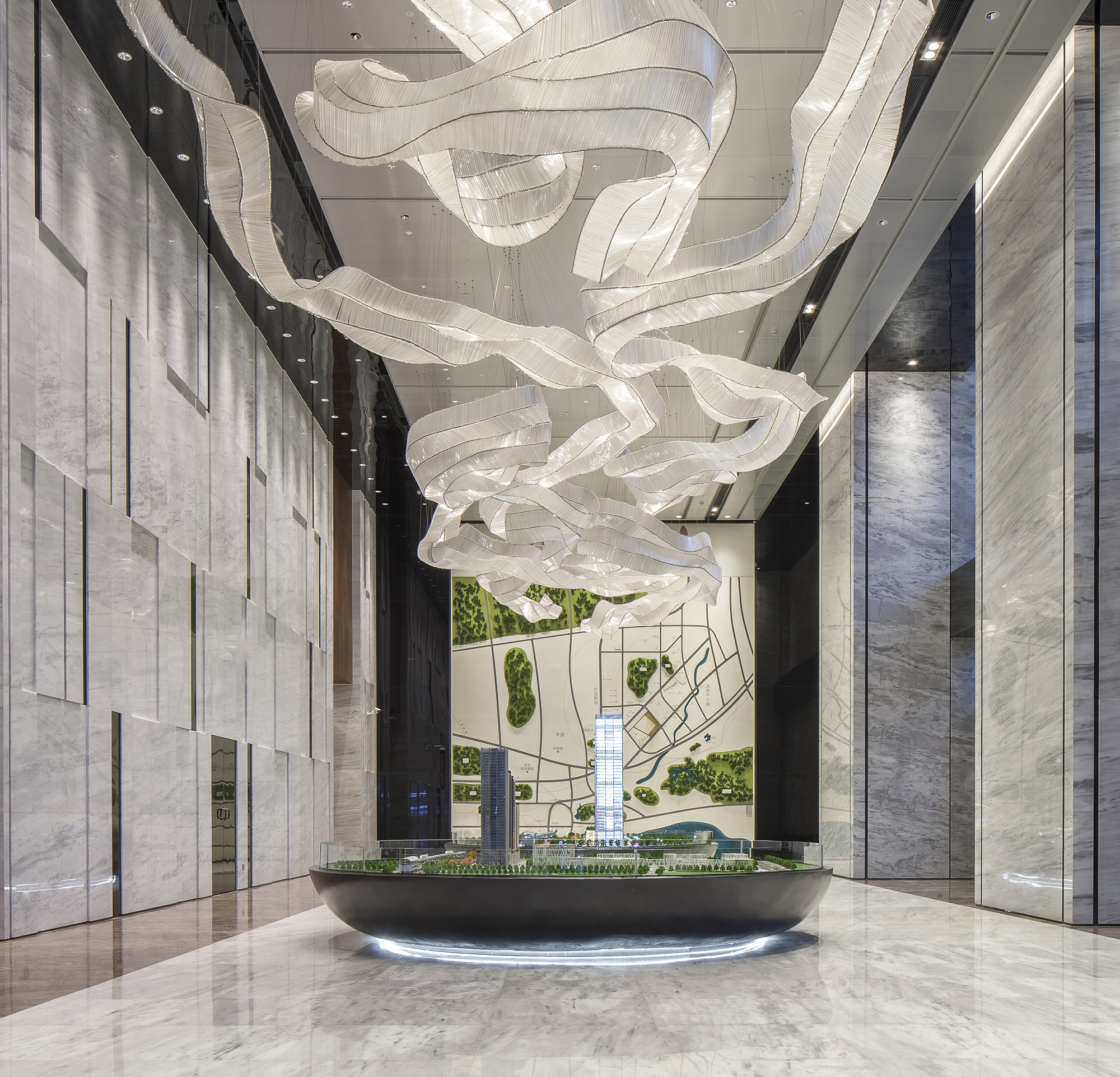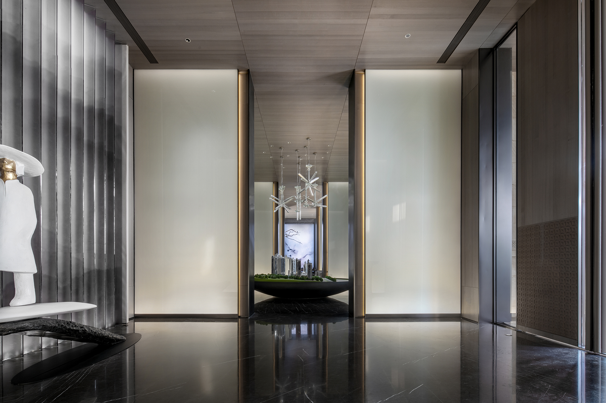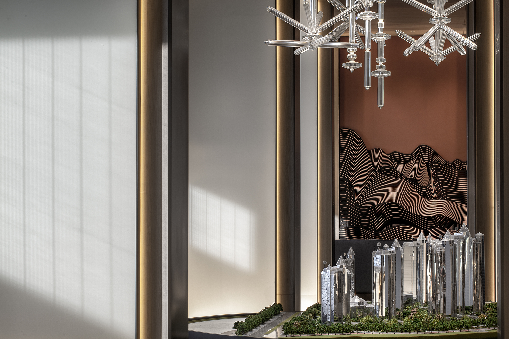 模型區(qū)同樣透溢出如水般清靈安詳?shù)臍庀?。原?chuàng)設(shè)計的水晶吊燈,極具現(xiàn)代感的造型與層次,特殊透明材質(zhì)做成的模型,與水晶燈相映成趣。整體空間與左右兩側(cè)的視域相通,形成視覺上的連廊效果,讓空間的韻致無限延伸。
