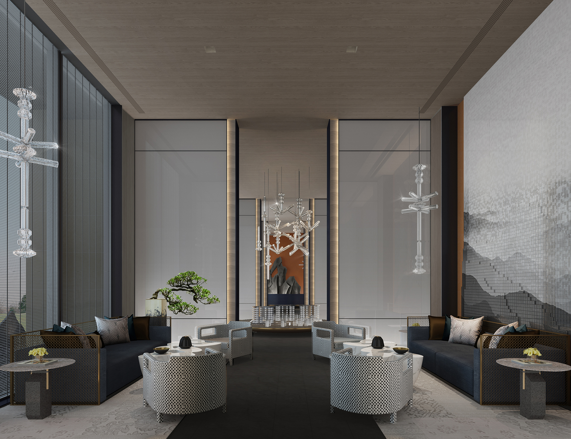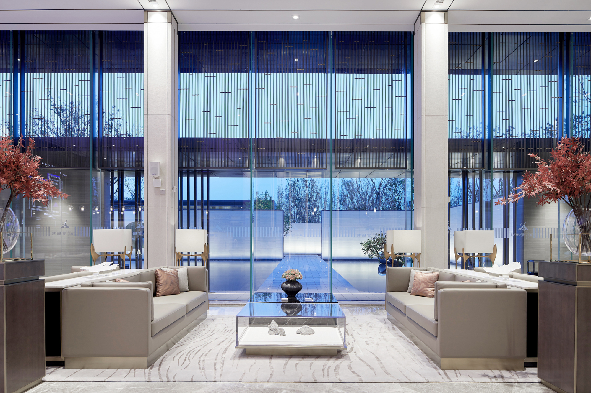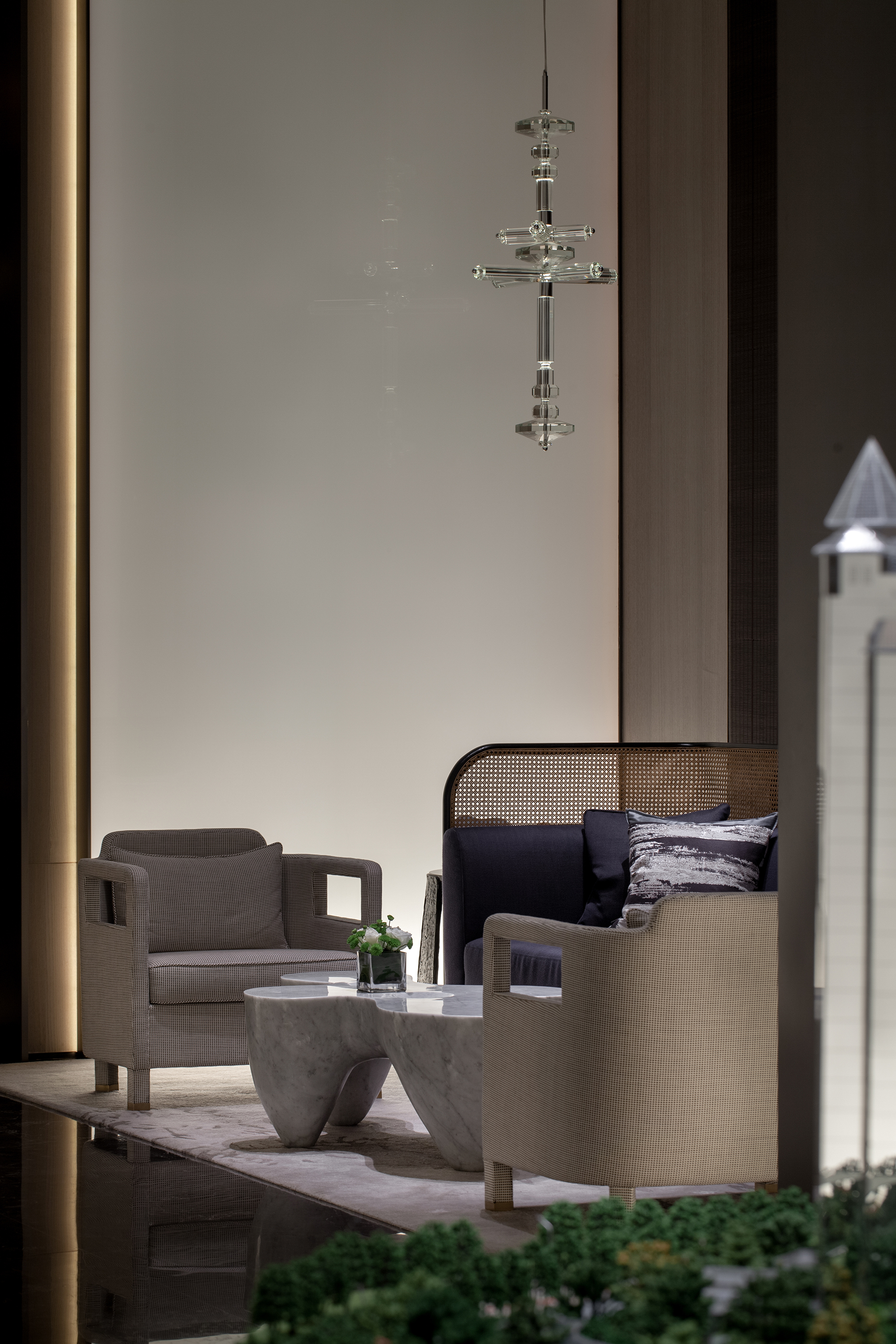 模型區(qū)同樣透溢出如水般清靈安詳?shù)臍庀?。原?chuàng)設(shè)計的水晶吊燈,極具現(xiàn)代感的造型與層次,特殊透明材質(zhì)做成的模型,與水晶燈相映成趣。整體空間與左右兩側(cè)的視域相通,形成視覺上的連廊效果,讓空間的韻致無限延伸。