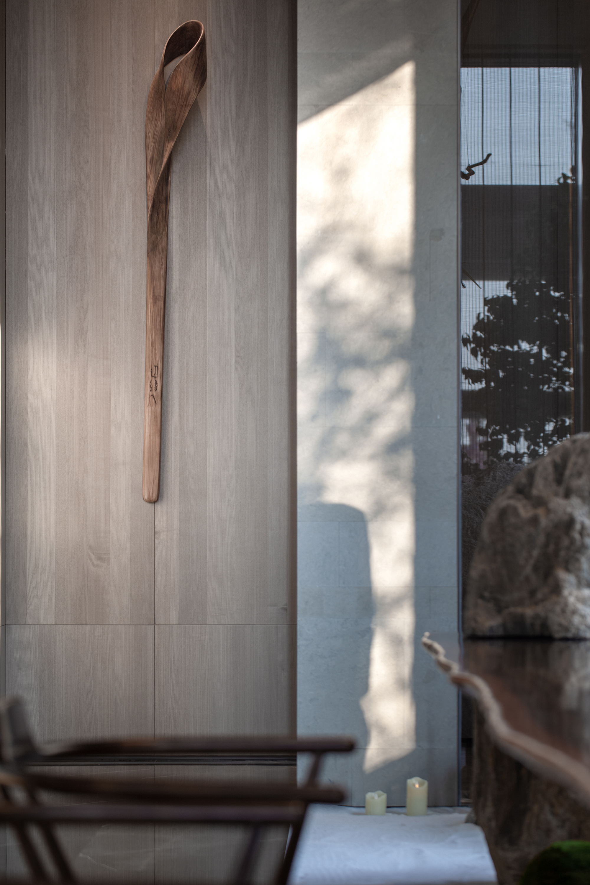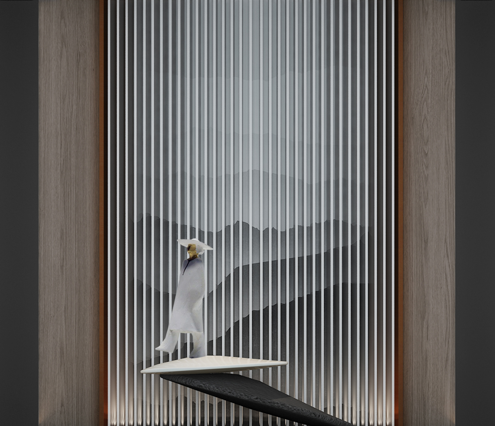 長長的藝術(shù)走廊提升了行走觀覽的意趣,于此,空間演化為可觀可賞的風景。寧靜的氛圍縈繞四周,以日本絹布為底材進行的群山手繪圖一一呈于眼前,恰有王心鑒《游青島嶗山》中描述的詩境,精巧的藝術(shù)小品和掛飾,結(jié)合現(xiàn)代手法的藝術(shù)提煉,讓空間的人文韻致悄然生發(fā)。