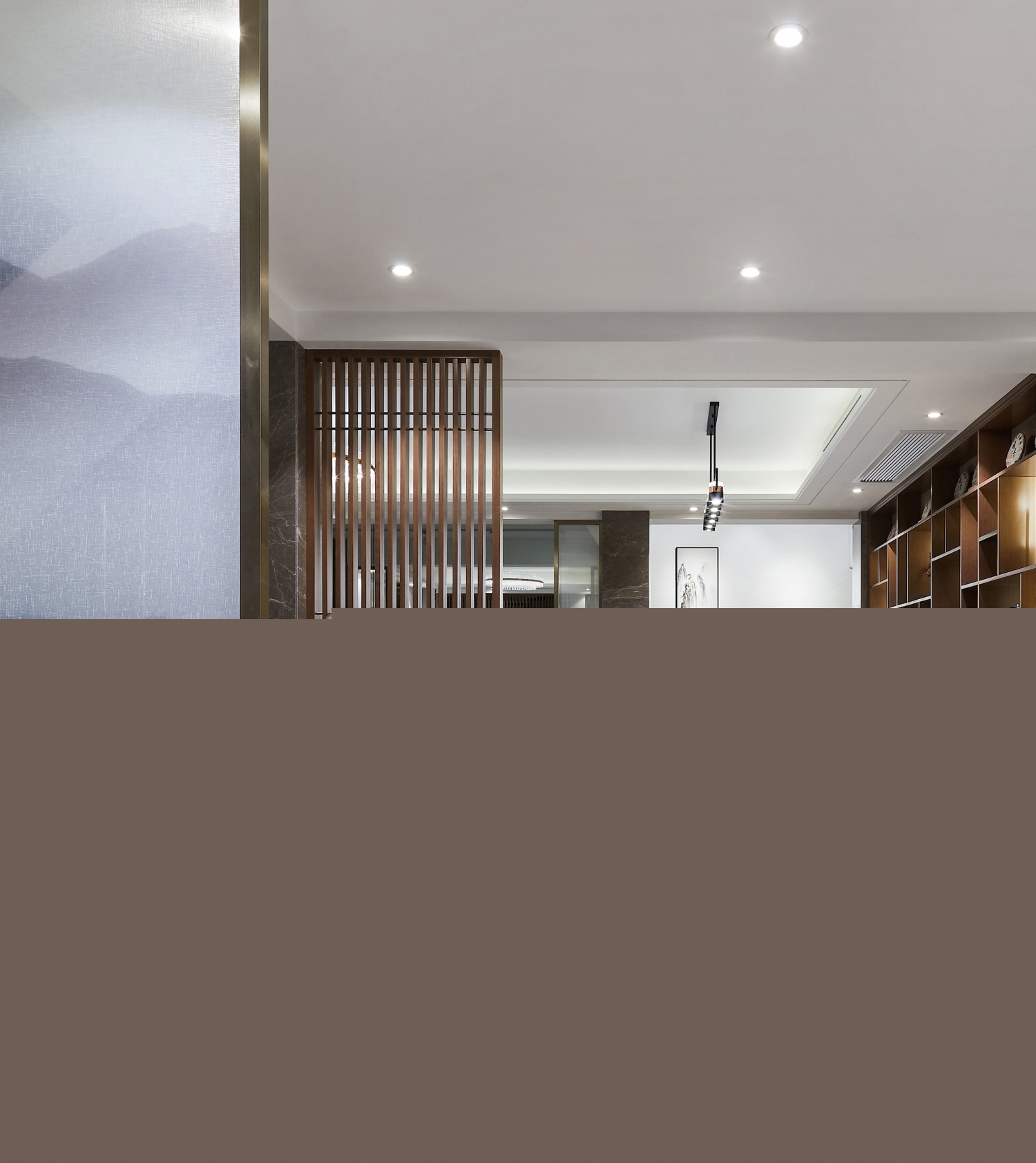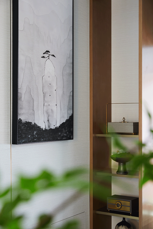 撤去傳統(tǒng)會(huì)客廳設(shè)計(jì)中的電視墻,構(gòu)設(shè)出一方可書寫讀閱的天地,設(shè)計(jì)彰顯著對回歸傳統(tǒng)精神生活方式的主張。筆墨紙硯、茶道瓷品、綠植小件表現(xiàn)著空間的中式情懷,于端莊大氣中透著內(nèi)斂的文雅風(fēng)韻。