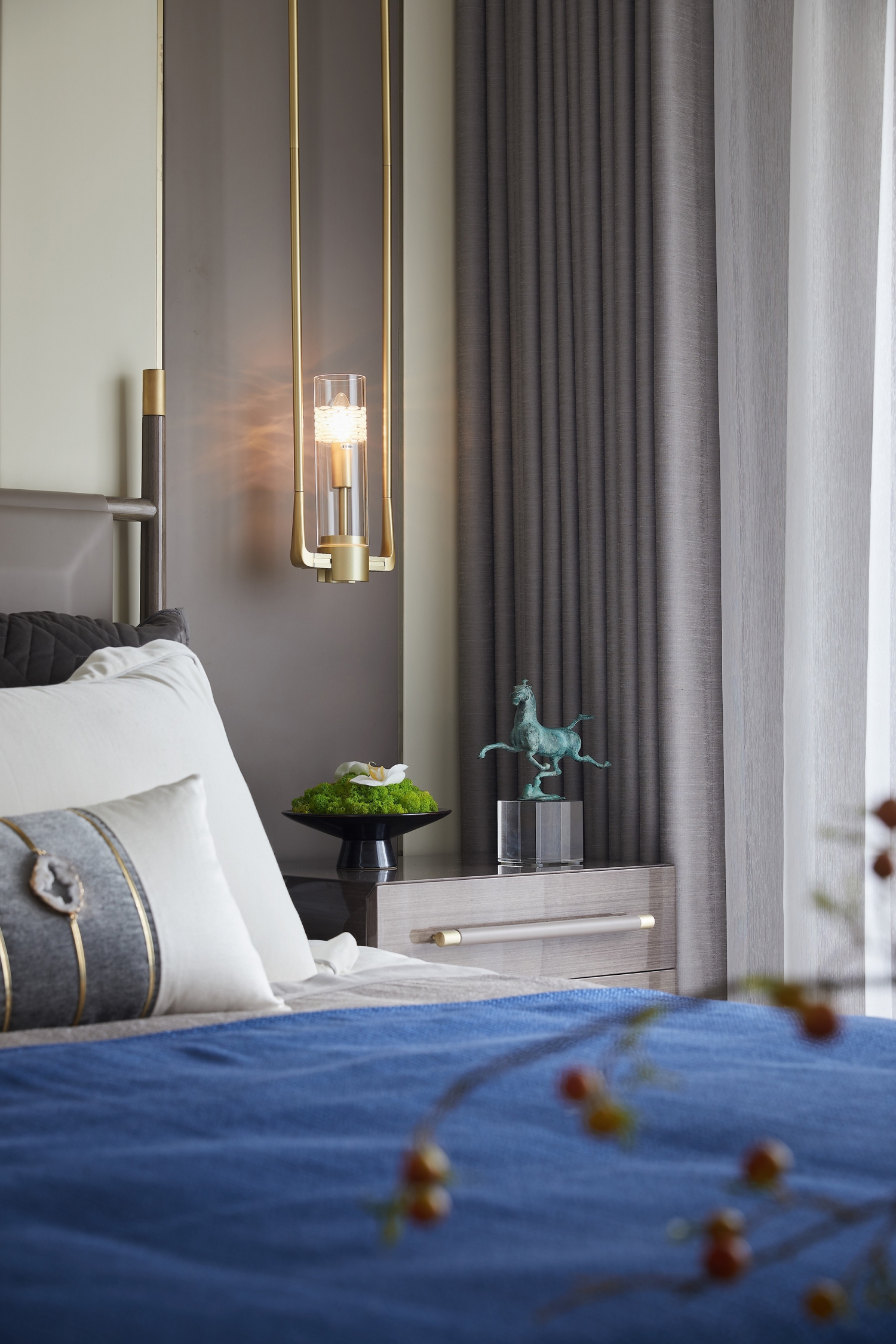 長輩房的設(shè)計(jì)主張清幽淡雅,空間的品性如文人那般不顯山不露水。絲質(zhì)與棉麻床品深具質(zhì)感,水墨掛畫、書卷、花卉、瓷具、陶馬等各類小品擺設(shè)其中,相映成趣,空間氣質(zhì)盈盈。陽光散透過紗簾,變得細(xì)碎而溫婉,營造出怡情養(yǎng)心的居室環(huán)境。