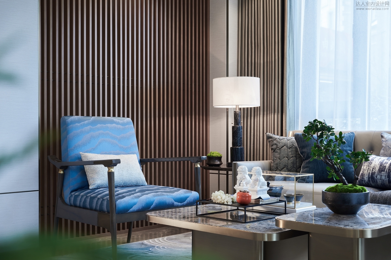 主臥套房獨(dú)占一層,寬敞的臥室與衛(wèi)浴間、步入式的衣帽間以及梳妝區(qū),打造主人房禮序與尊貴并具的生活儀式。湖藍(lán)與水墨灰糅合、木制與大理石搭配、棉麻與絲綢互映……空間所用的材質(zhì)均顯露著典雅的質(zhì)感,現(xiàn)代簡約形制與東方意蘊(yùn)無縫融合,營造沉穩(wěn)高雅的居室氛圍。