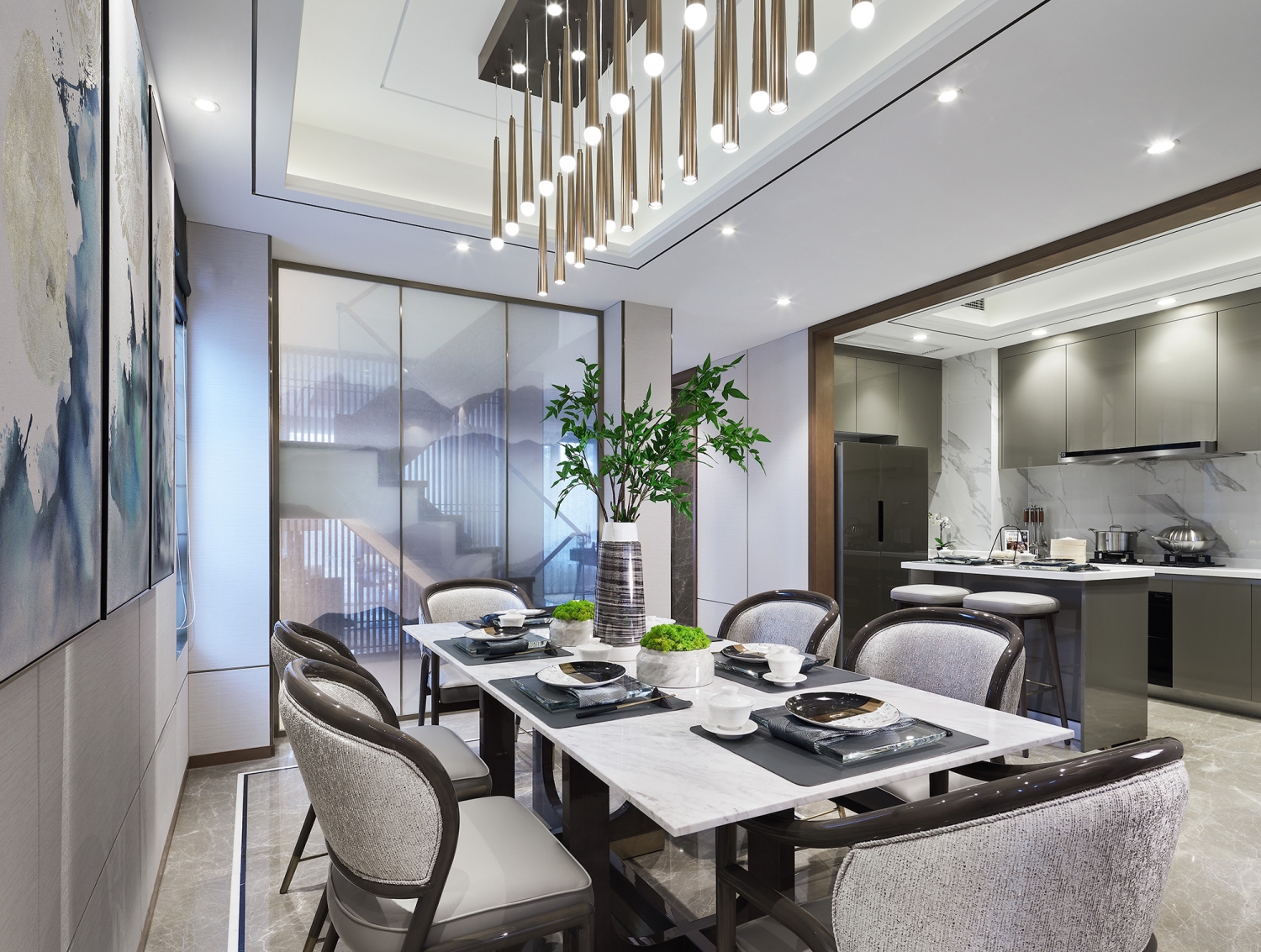 餐廳采用對稱式的布局構(gòu)設(shè),用煙灰色的淡雅鋪陳空間。一幅描繪著縹緲煙嵐的水墨畫,將中式風(fēng)格的特征注入,與大理石、軟包、棉麻等現(xiàn)代材質(zhì)加以融合,打造出更貼切當(dāng)下審美風(fēng)格的就餐空間,格調(diào)更顯高雅端妍。