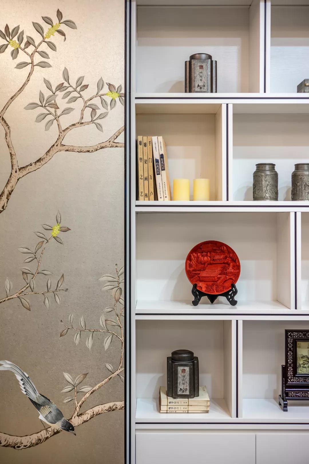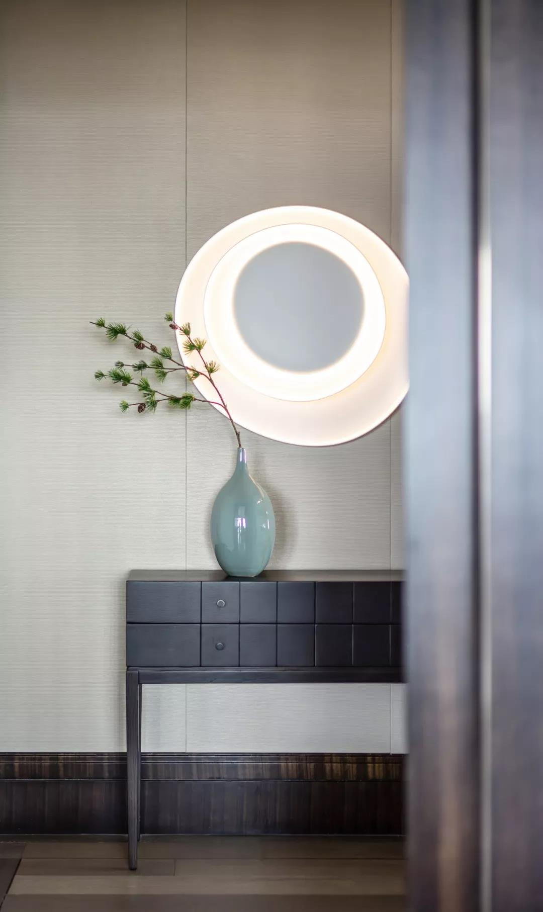 踏入家門(mén),映入眼簾的是絹絲手繪屏風(fēng),寥寥數(shù)筆寫(xiě)意了一幅“小荷才露尖尖角,早有蜻蜓立上頭”的生動(dòng)場(chǎng)景。白天,明媚的陽(yáng)光灑進(jìn)來(lái),讓人產(chǎn)生小池、微風(fēng)與荷葉田田的自然聯(lián)想。夜晚,當(dāng)忙碌一天的男主人回到家里,在溫煦的燈光下,空氣中的靜逸與幸福感足以驅(qū)走一天的疲憊。