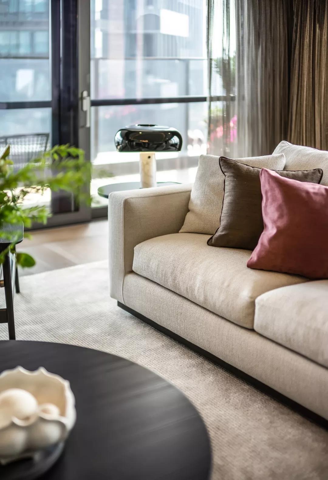 面對(duì)7米寬的客餐廳開(kāi)間,設(shè)計(jì)師以亞麻與木色這樣低飽和度的色系,打造出簡(jiǎn)雅柔和的空間韻調(diào),為日后的生活場(chǎng)景留足想象與施展的余地。意大利 Minotti 家具品牌沙發(fā)與實(shí)木柜搭配,在柔光下呈現(xiàn)出靜穆的美。裝飾小品不多且簡(jiǎn)凈,幾只茶壇,幾本閑書(shū),嘆茶翻書(shū),便足以架構(gòu)起居住者的生活日常。