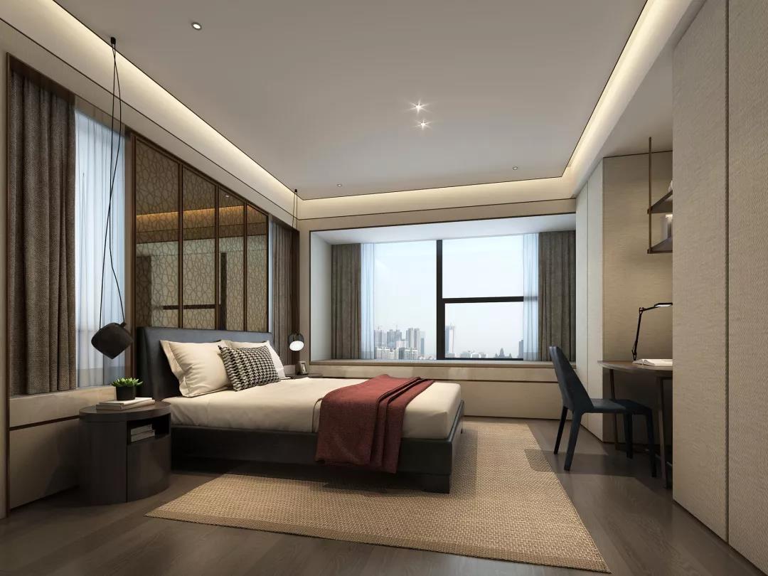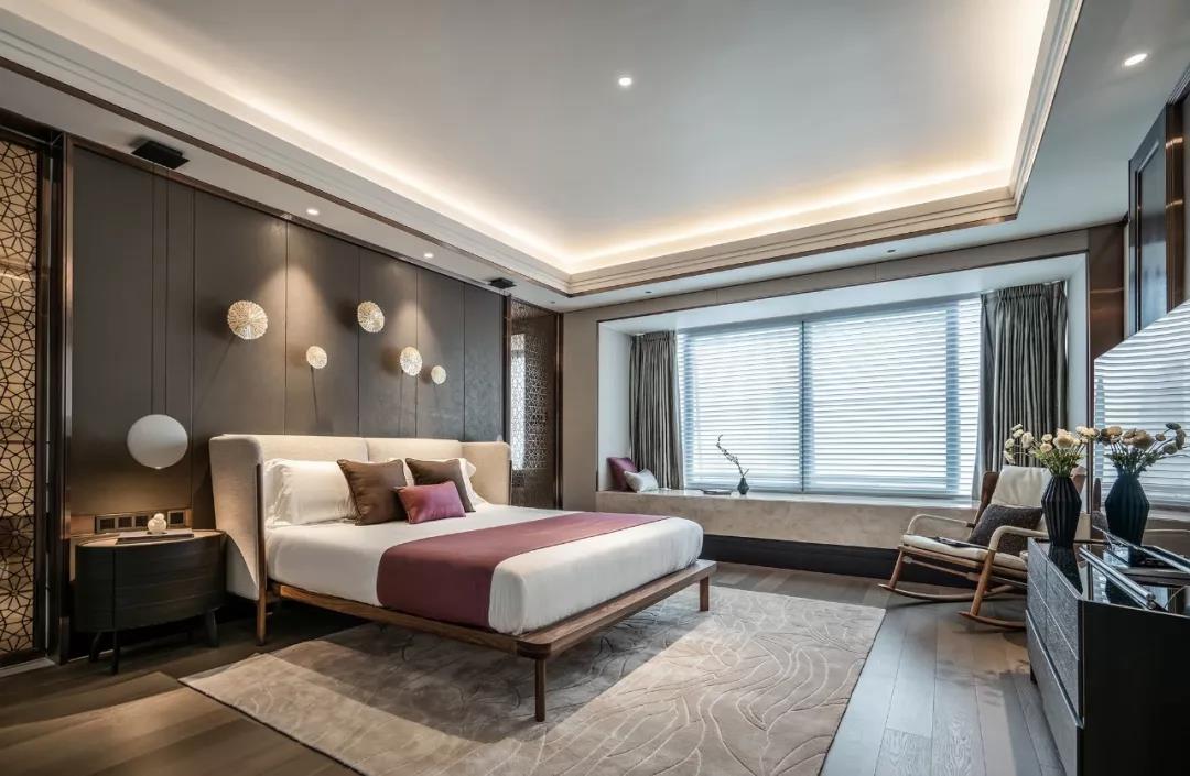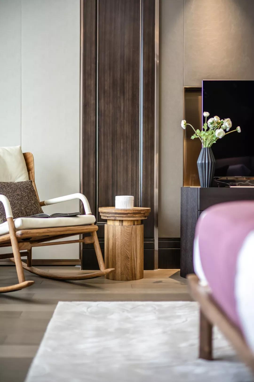 主臥無(wú)主燈設(shè)計(jì),而是將燈光收納于吊頂內(nèi),使室內(nèi)顯得更為柔和安適。設(shè)計(jì)將真正的尊享藏于每個(gè)細(xì)節(jié),精細(xì)打磨的墻面與木制地板、細(xì)膩柔軟的暖棕色床品,通過(guò)材質(zhì)的光感隱透簡(jiǎn)凈高雅的質(zhì)感美學(xué)。