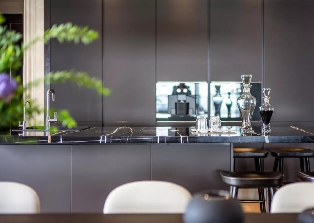 西廚島臺(tái)采用大理石與木材無(wú)縫貼合,睿智的黑在空間中煥發(fā)著張力,突出設(shè)計(jì)臻選的態(tài)度與品質(zhì)的精尚。