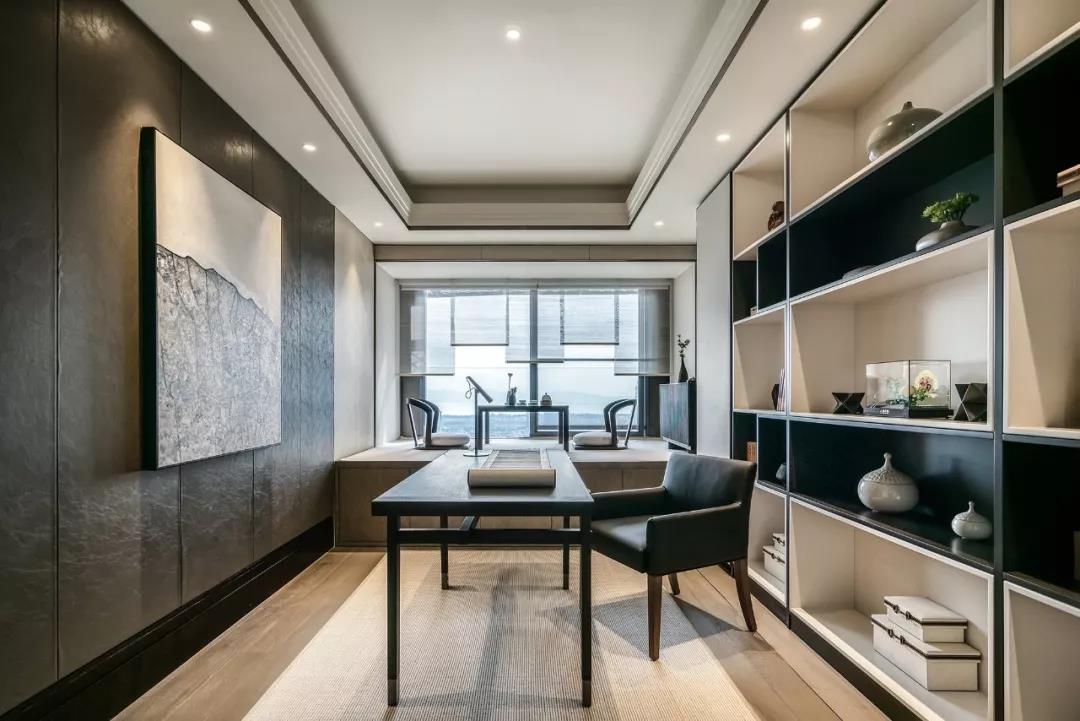約64㎡的通透主臥套房設(shè)計(jì),以三進(jìn)的方式將書(shū)房、臥室、主衛(wèi)進(jìn)行構(gòu)設(shè),使空間具備更好的秩序感與私密性。書(shū)房以簡(jiǎn)凈的黑白色調(diào)對(duì)話,現(xiàn)代極簡(jiǎn)語(yǔ)匯與中式情韻在空間中相融相生,分外靜雅。飄窗區(qū)被設(shè)計(jì)為茶室,原木、清茶、松葉、花卉交匯在一起,清甜而微香。晨間的日光柔和,夜晚的月色明澈,一杯清茶,共待流年。