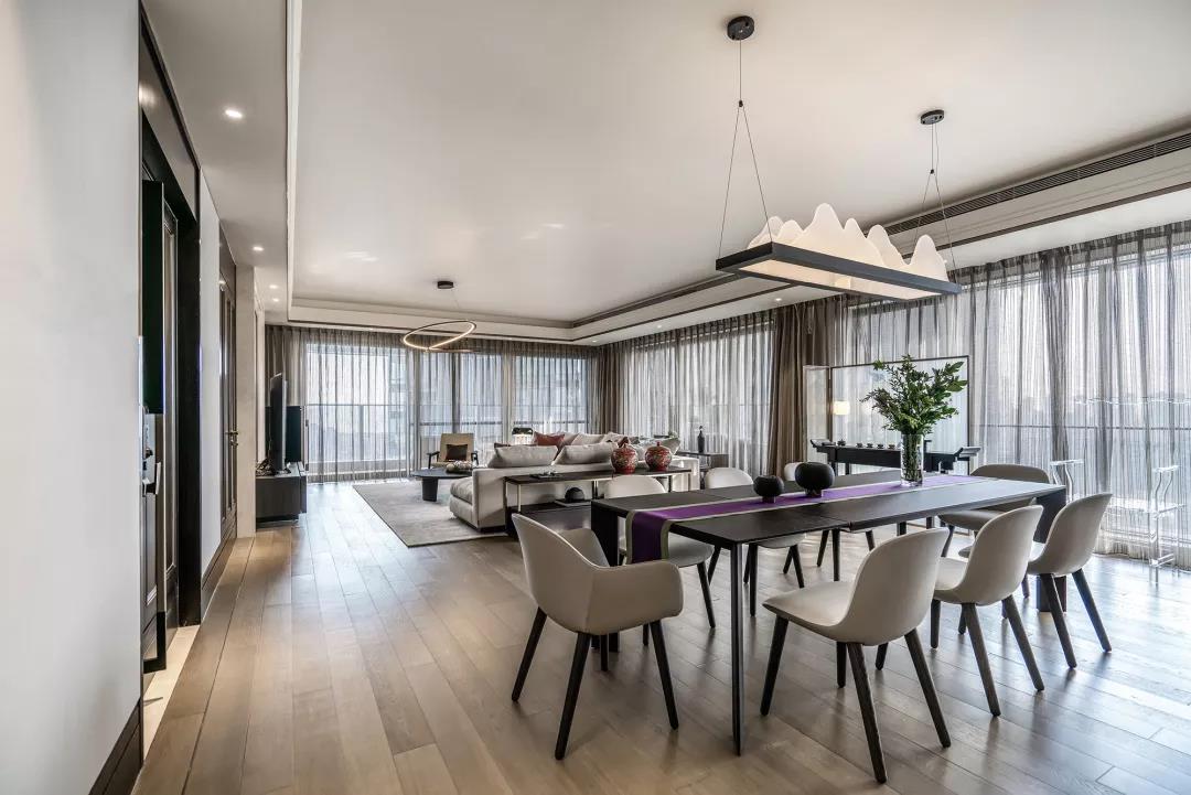 餐廳延續(xù)會(huì)客廳空間的基調(diào),臻選意大利 Poliform 餐桌椅,精致的亞克力山水造型燈飾,以簡(jiǎn)單的形制禮遇生活之美。