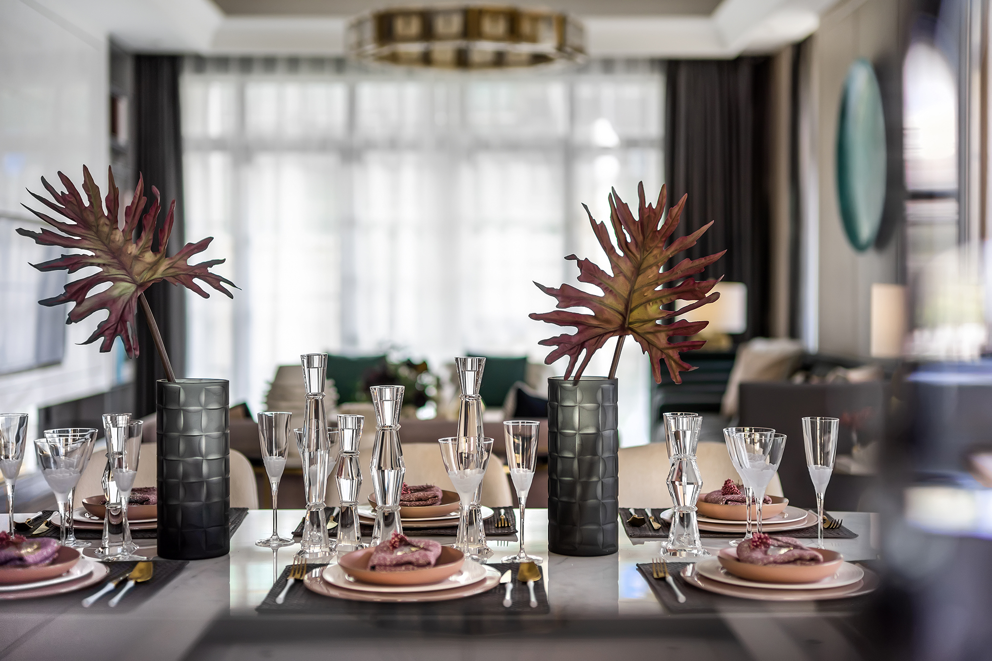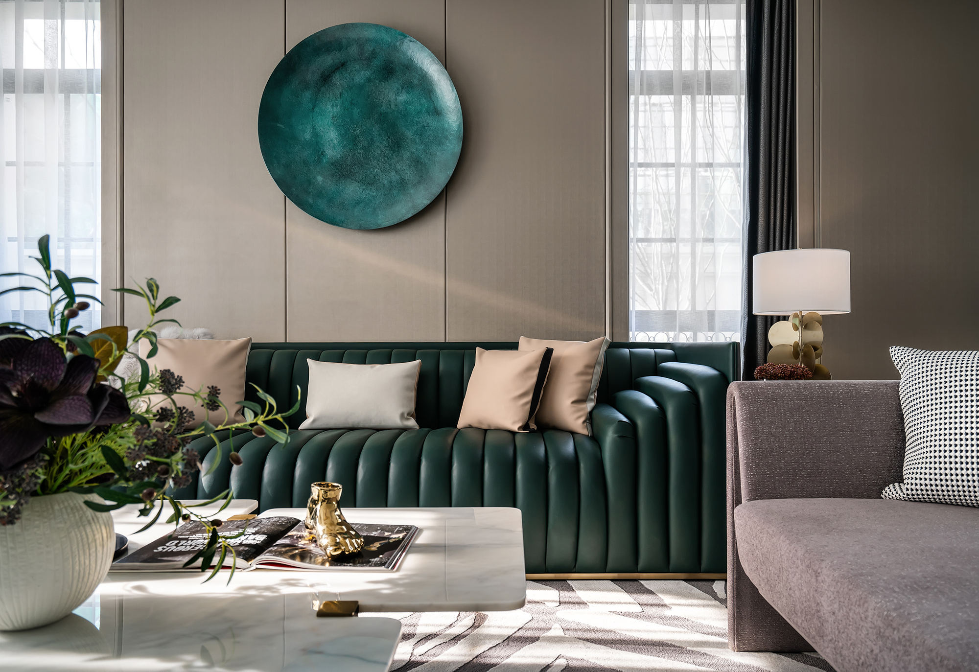 設(shè)計(jì)師在顏色的選用上高級(jí)且富有質(zhì)感,臻選科里斯灰、靜謐粉、孔雀綠及赭橙,設(shè)色多而不亂,既有復(fù)古感,又不乏時(shí)尚。造型別致的沙發(fā)營(yíng)造著輕盈韻律感,高定天鵝絨單椅、大理石桌幾與精致的琉璃吊燈,渲染空間摩登的藝術(shù)格調(diào)。