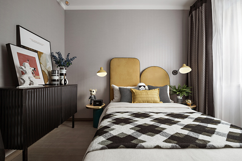 色彩語素流轉(zhuǎn)至臥室空間,設(shè)計臻選煙波灰、明媚黃、睿智黑,配色比例深淺有致,將藝術(shù)詩性的浪漫格調(diào)滲透至每一個角落。背景墻的豎紋肌理與抽象畫、地毯的繁復(fù)線條意境交織,素雅細(xì)膩的床品浸染著溫柔婉麗的意涵,營造可觸的舒適休憩氛圍。