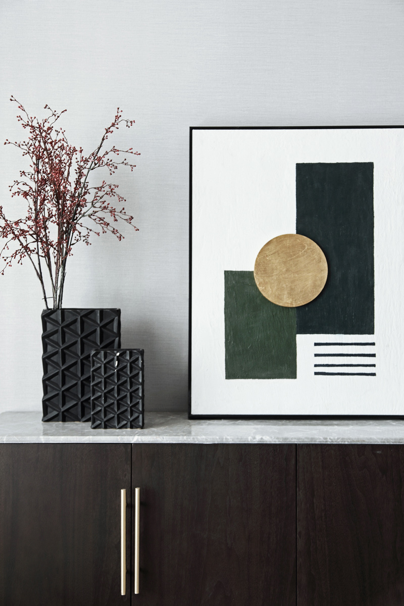 空間設(shè)計最終得以完美呈現(xiàn),是設(shè)計師審美態(tài)度與美學(xué)經(jīng)驗一致營造的結(jié)果。臥室空間以氣質(zhì)黑與優(yōu)雅白的調(diào)和,糅合材質(zhì)的肌理與線條,將現(xiàn)代設(shè)計的極簡之美展演得淋漓盡致,同時介入幾何形制元素,以藝術(shù)畫、別致裝飾框、樸拙玉石、風(fēng)干的花枝等東方品質(zhì)為飾,東方自然雅趣集于此。