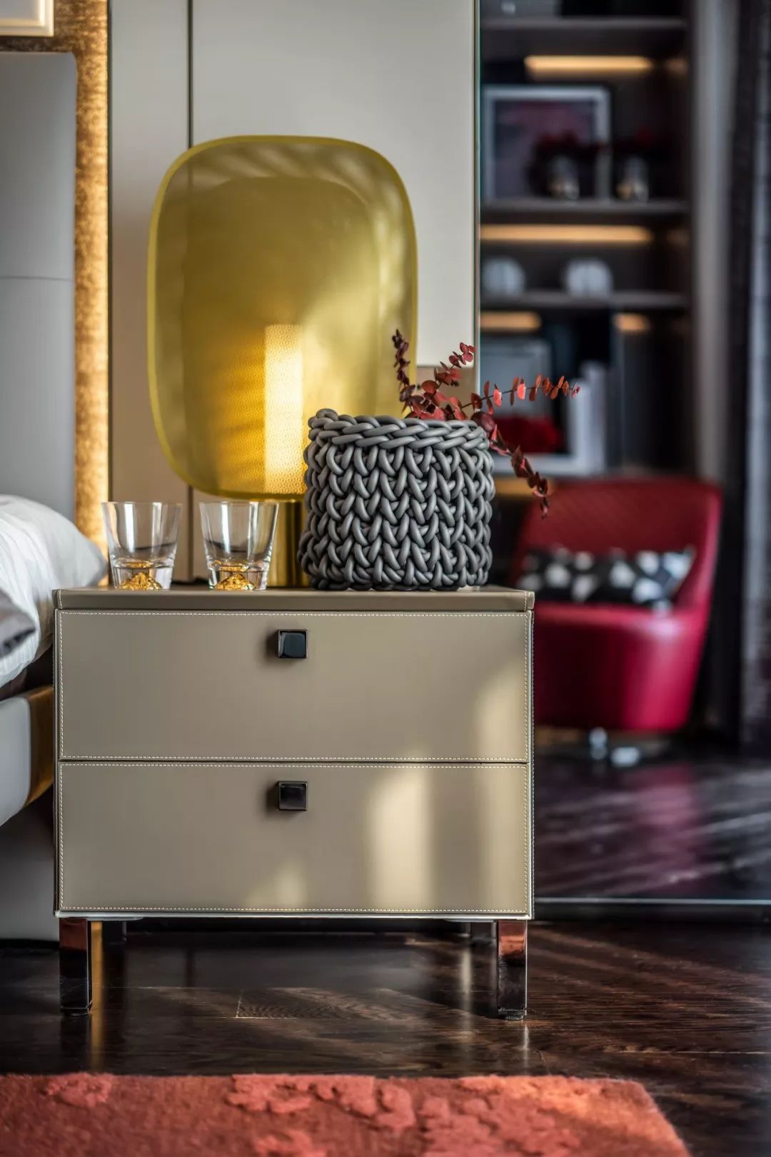 在邦邦看來,設(shè)計不止是營造一個空間,更是刻畫一個生活發(fā)生的場所,聯(lián)結(jié)一種精神文化的載體。臥室空間中,邦邦于冷靜克制的灰調(diào)中介入細(xì)節(jié)可品的紅調(diào)單椅、床品,通過場景化的燈帶藝術(shù),以寧靜自然的視覺具象引發(fā)情感共鳴和詩意想象的合奏,虛實相協(xié),況味頓生。