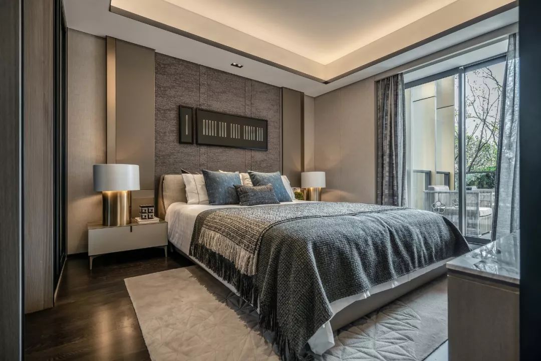 睿智黑、古銅金、優(yōu)雅灰在主臥交織共映,邦邦將幾何元素編織其間,于抽象與具象、虛與實的觀感和想象中,發(fā)起規(guī)則與不規(guī)則的紋理互動,表達(dá)時代領(lǐng)軍階層的藝術(shù)精神,匹配主人房的至臻格調(diào)與審美品味。