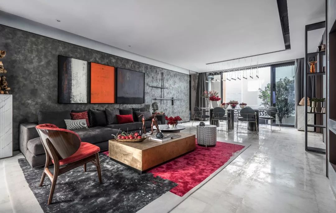 在這個143㎡的豪宅項目中,邦邦通過重復(fù)具象的妍麗紅調(diào),將美學(xué)要義融于現(xiàn)代與極簡的平衡中,在明麗和絢爛的藝術(shù)氣息中,空間煥發(fā)出蓬勃的生命力。