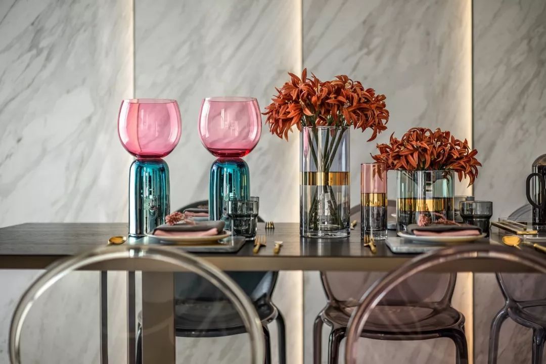自舒展的客廳場域步入餐廳,層高的變化使室內(nèi)大空間有目的地被界分,構(gòu)成了氣場節(jié)奏的變幻。五折形制的水紋大理石背景墻自折痕處散發(fā)柔光,與對稱的幾何形制組燈輝映,觀照空間內(nèi)飾的細(xì)節(jié),于鮮妍花藝、通透多彩的杯盞與餐椅上精筑藝術(shù)情致,完美詮釋了現(xiàn)代高雅空間的出塵氣質(zhì)。