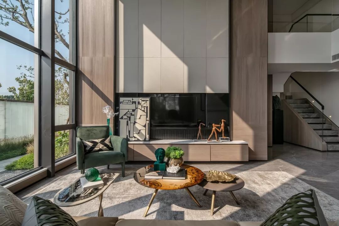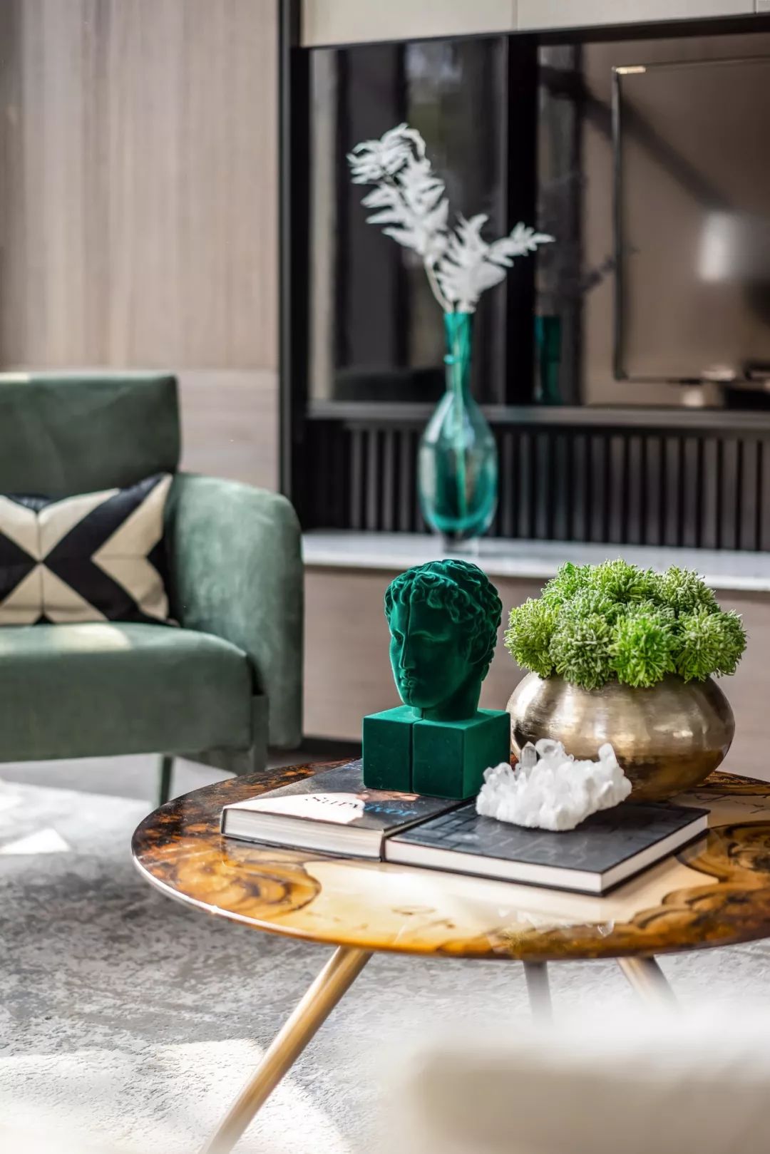 雙層挑空客廳搭配一面全明落地玻璃窗,將室內(nèi)室外的區(qū)隔通透化,同時鄰接陽臺,寫實“綠窗斜動搖風(fēng)竹,竹風(fēng)搖動斜窗綠”的景致,廣納清新自由空氣。翡翠綠與古金色的配比,冷色調(diào)與暖色調(diào)的碰撞,述說著沉靜、深厚、簡練的造型語言,凝聚生活中每一段歡樂時光的瞬時光澤。