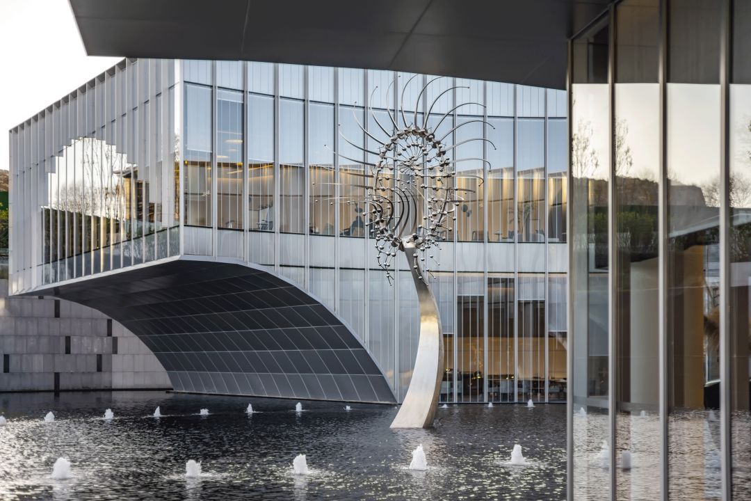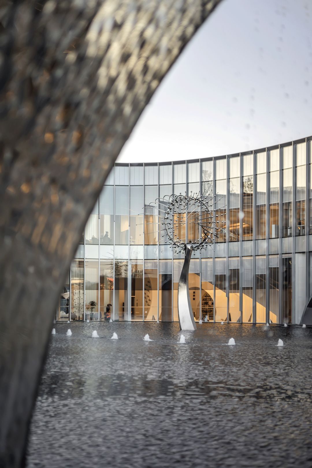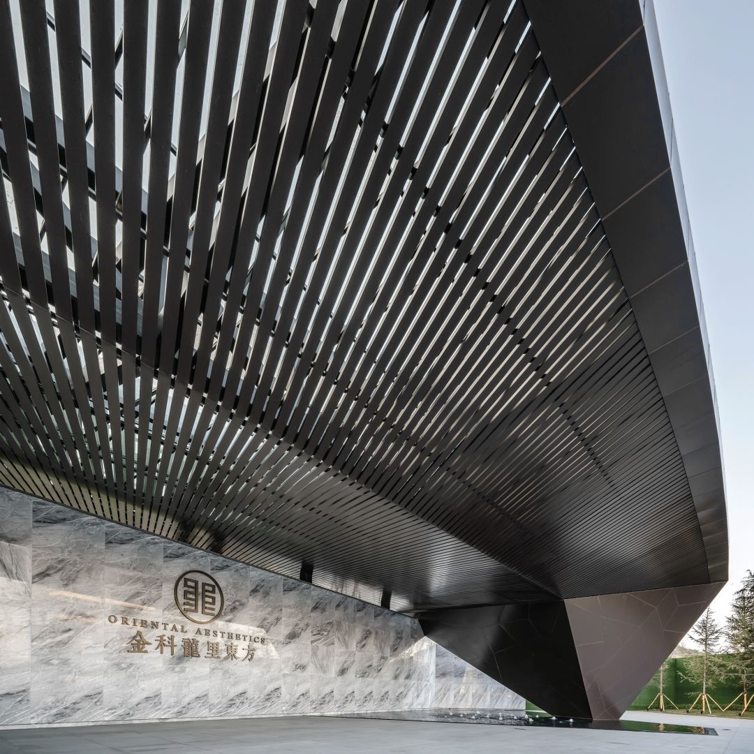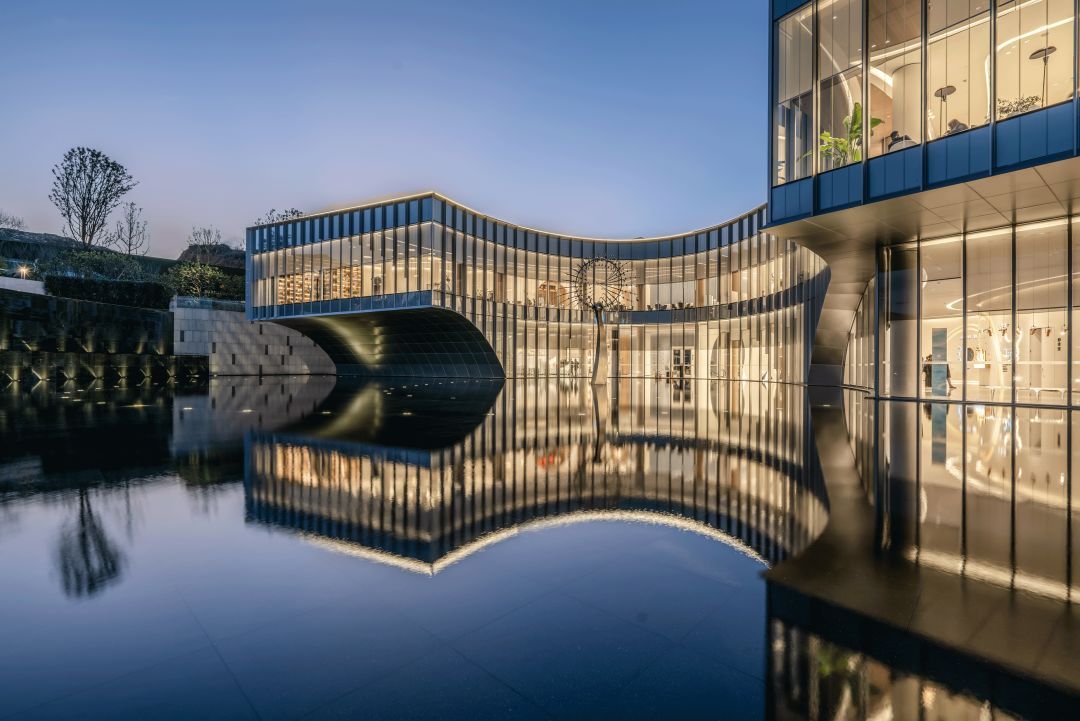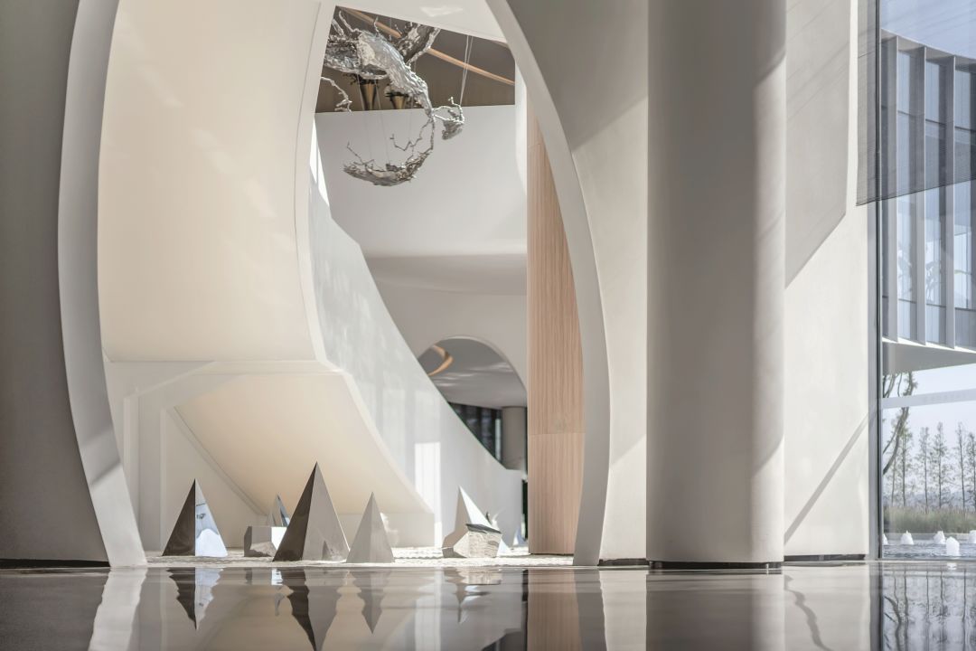 接待區(qū)就在這一理念之下,景觀以水之形態(tài)為伊始展開(kāi),而后又融入了似水也像風(fēng)的流動(dòng)意象,互相依融互不侵犯,這種結(jié)合東方元素的處理,又與建筑外觀的極盡現(xiàn)代形成對(duì)比。