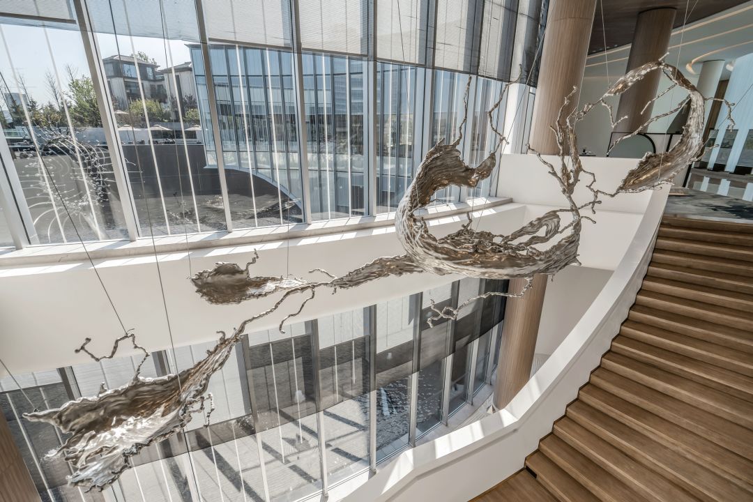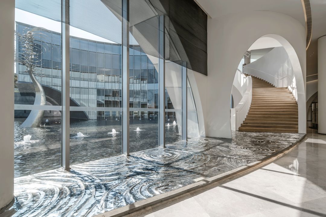 在樓梯間和水紋平臺(tái),都設(shè)計(jì)了大尺度不同形態(tài)展現(xiàn)水的藝術(shù)裝置,水花飛濺在空中,點(diǎn)點(diǎn)漣漪在腳下。