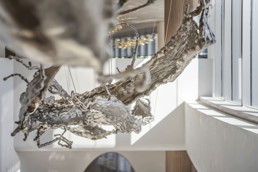 空間在完成硬裝設(shè)計(jì)后本身就具有了很好的水云造型及藝術(shù)性,因此藝術(shù)品的選擇變更具挑戰(zhàn),為了避免過(guò)猶不及,他們極力選擇抽象和具有想象力的藝術(shù)作品置入,貼合主題且在形態(tài)上活潑有生氣。