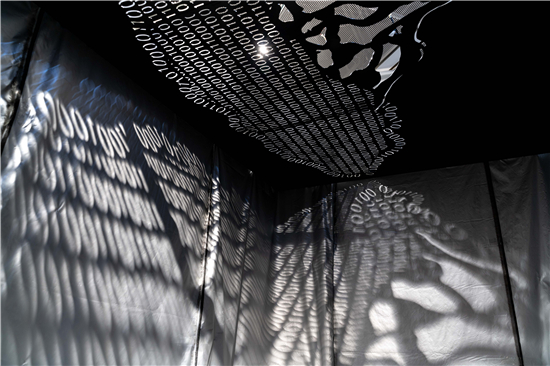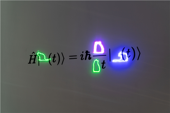 愛爾蘭新媒體藝術家David Keohane帶來的投影裝置《輪廓-樸木》和激光裝置《量子糾纏》?!读孔蛹m纏》將一系列關于貓的激光動畫投射在墻上,貓是量子力學領域一個著名的思想實驗的象征,動態(tài)的貓成為靜態(tài)方程式的組成元素,他們是活著的,也是非活著的——就像薛定諤定律中的貓一樣,藝術家David受到薛定諤定律啟發(fā)創(chuàng)作了這幅作品向量子理論領域致敬。