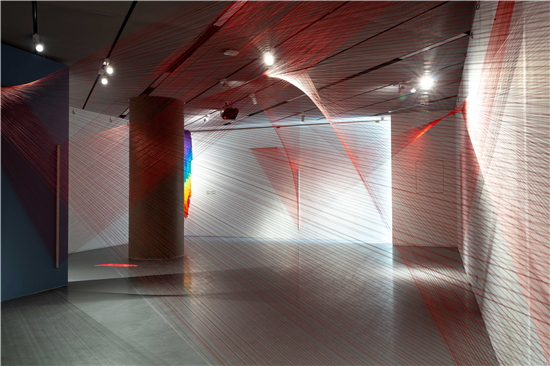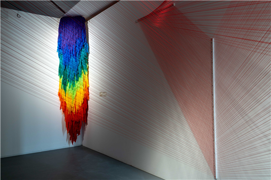 裝置作品《光的彼岸》和《一噸彩虹》帶來強烈的色彩沖擊,出自新銳跨媒介藝術家顧奔馳之手,藝術家在現(xiàn)場用上千根色彩纖維構架了一個莫比烏斯三角形的紅色世界,線與線之間的纏繞和穿插,隱喻著人與人、人與社會、人與宇宙之間的關系。